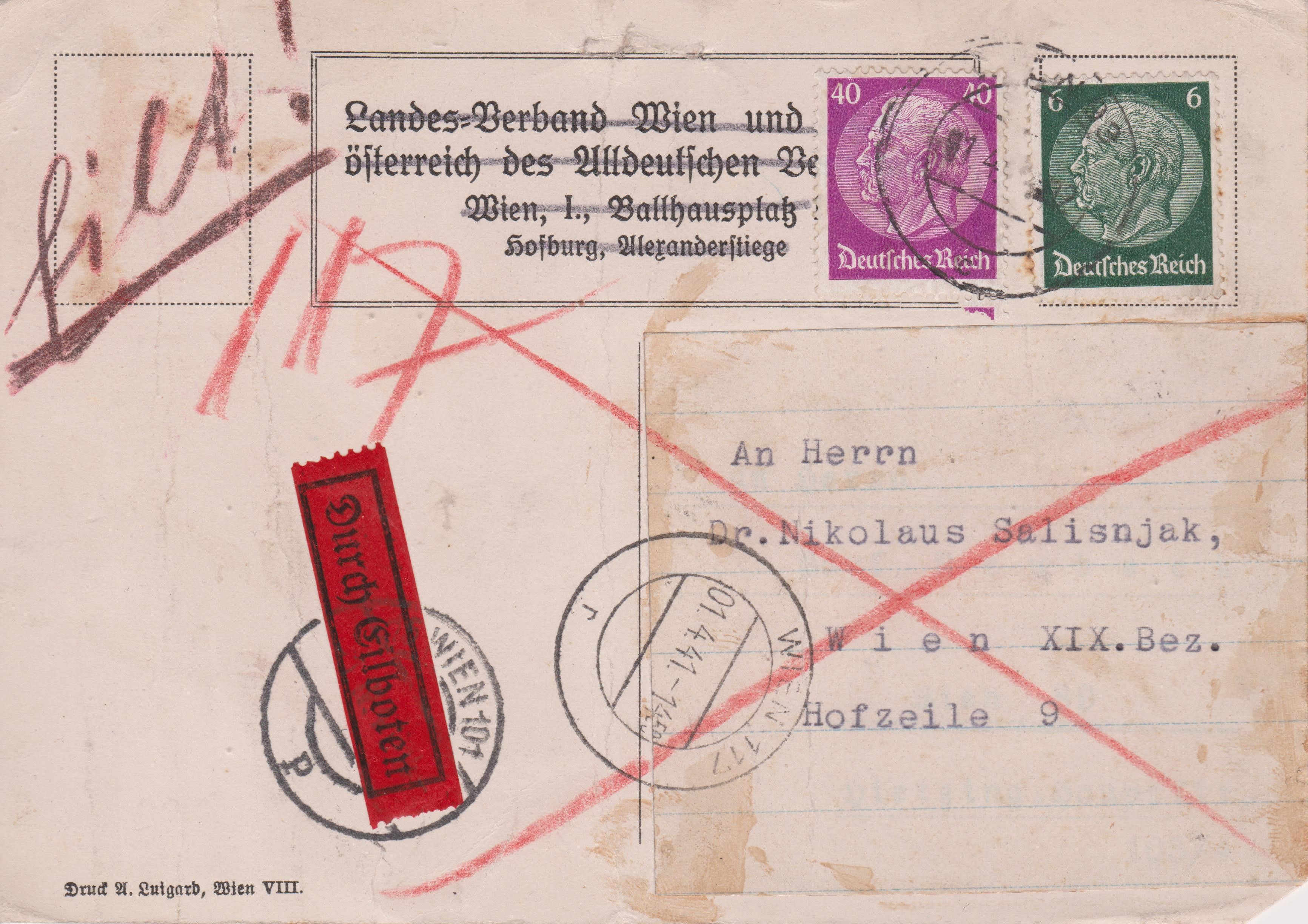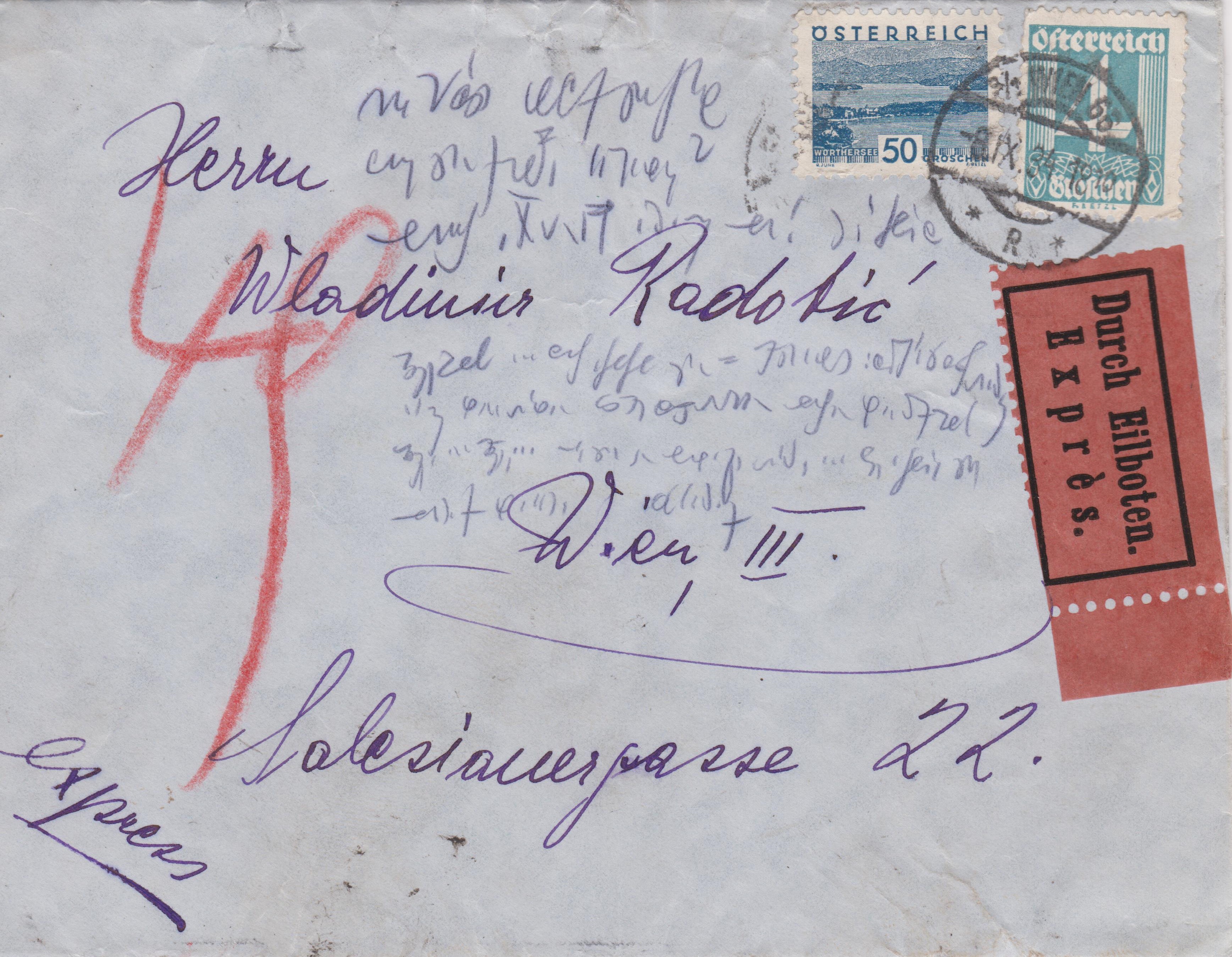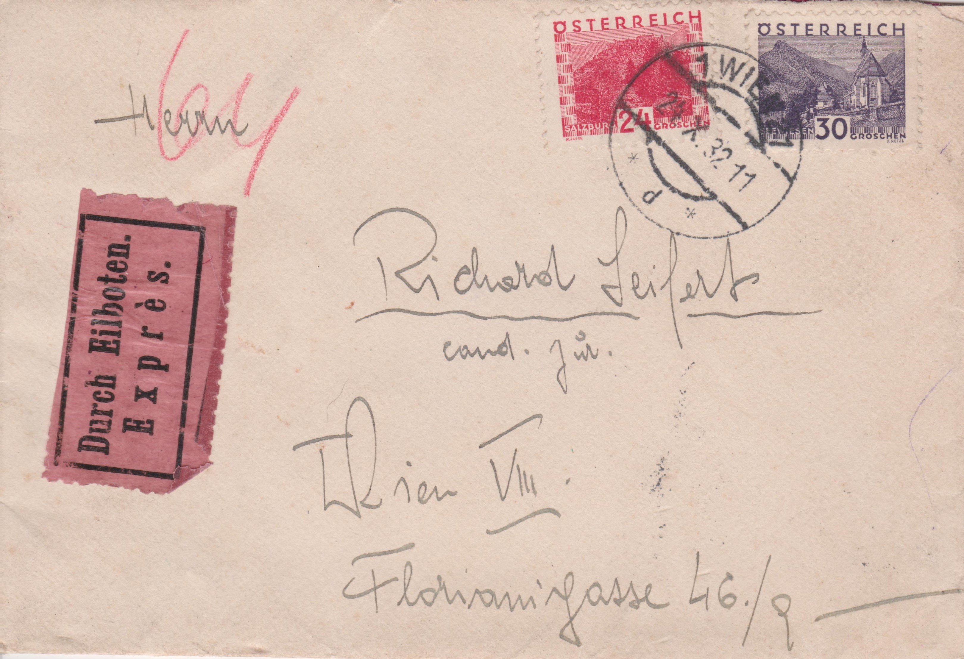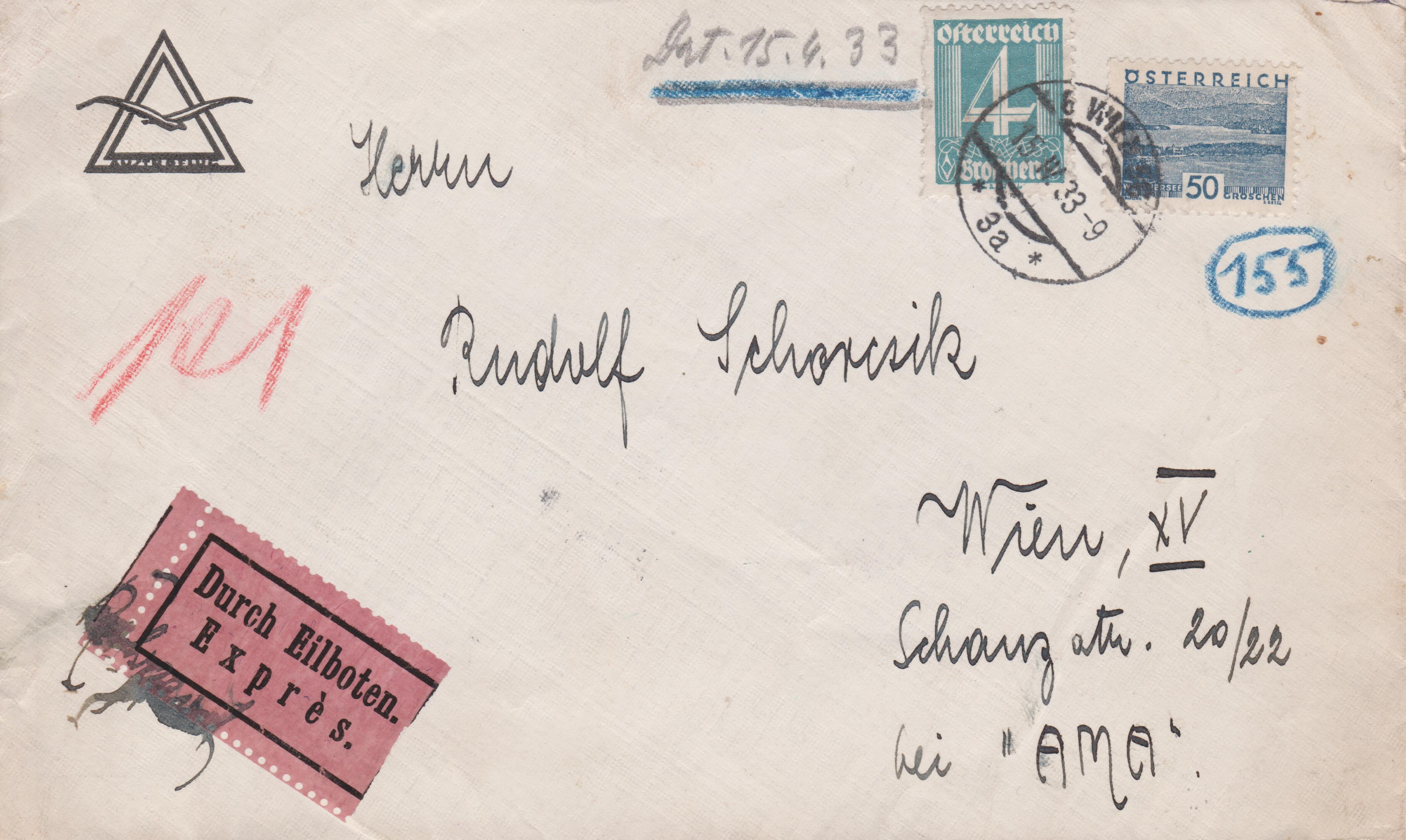 Brief "Durch Eilboten", adressiert nach "Wien, XV", aufgegeben in Wien am 15.04.1933: