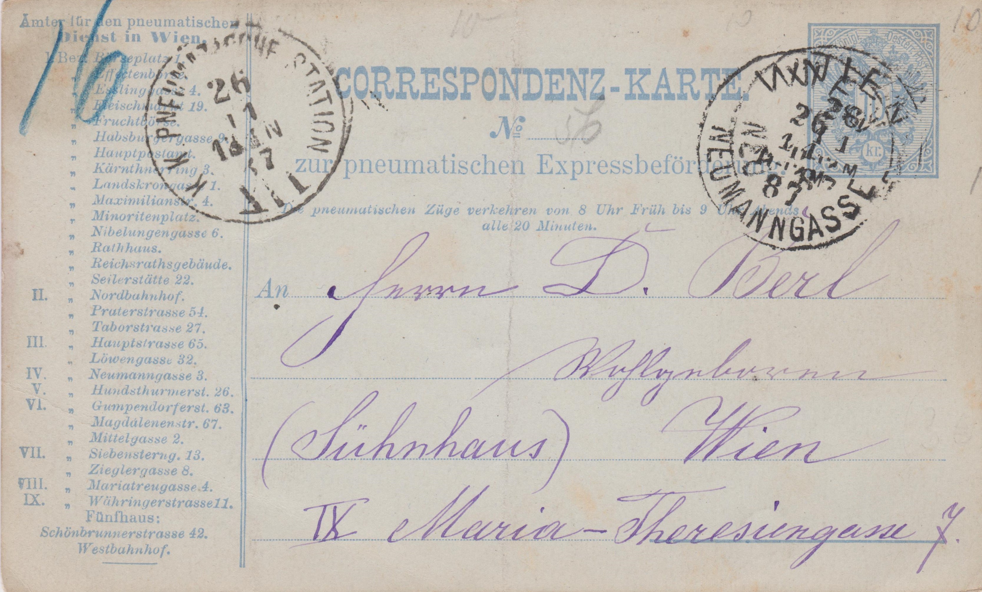 "CORRESPONDENZ-KARTE zur pneumatischen Expressbeförderung" mit einer eingedruckten Liste der "Ämter für den pneumatischen Dienst in Wien" gebraucht am 26.11.1887: