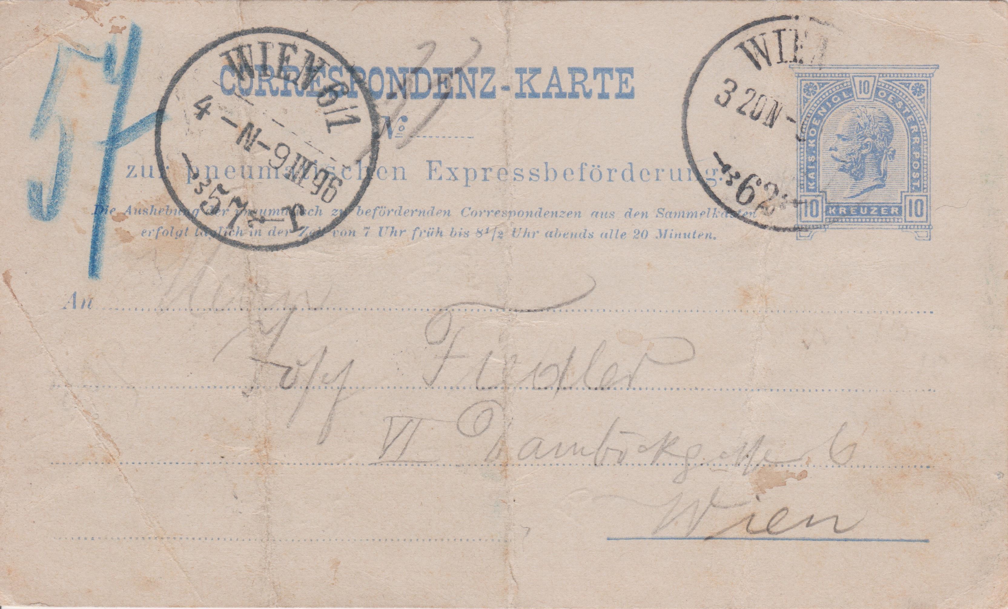"CORRESPONDENZ-KARTE zur pneumatischen Expressbeförderung" gebraucht am 09.03.1896 von WIEN 62 nach WIEN 57:
