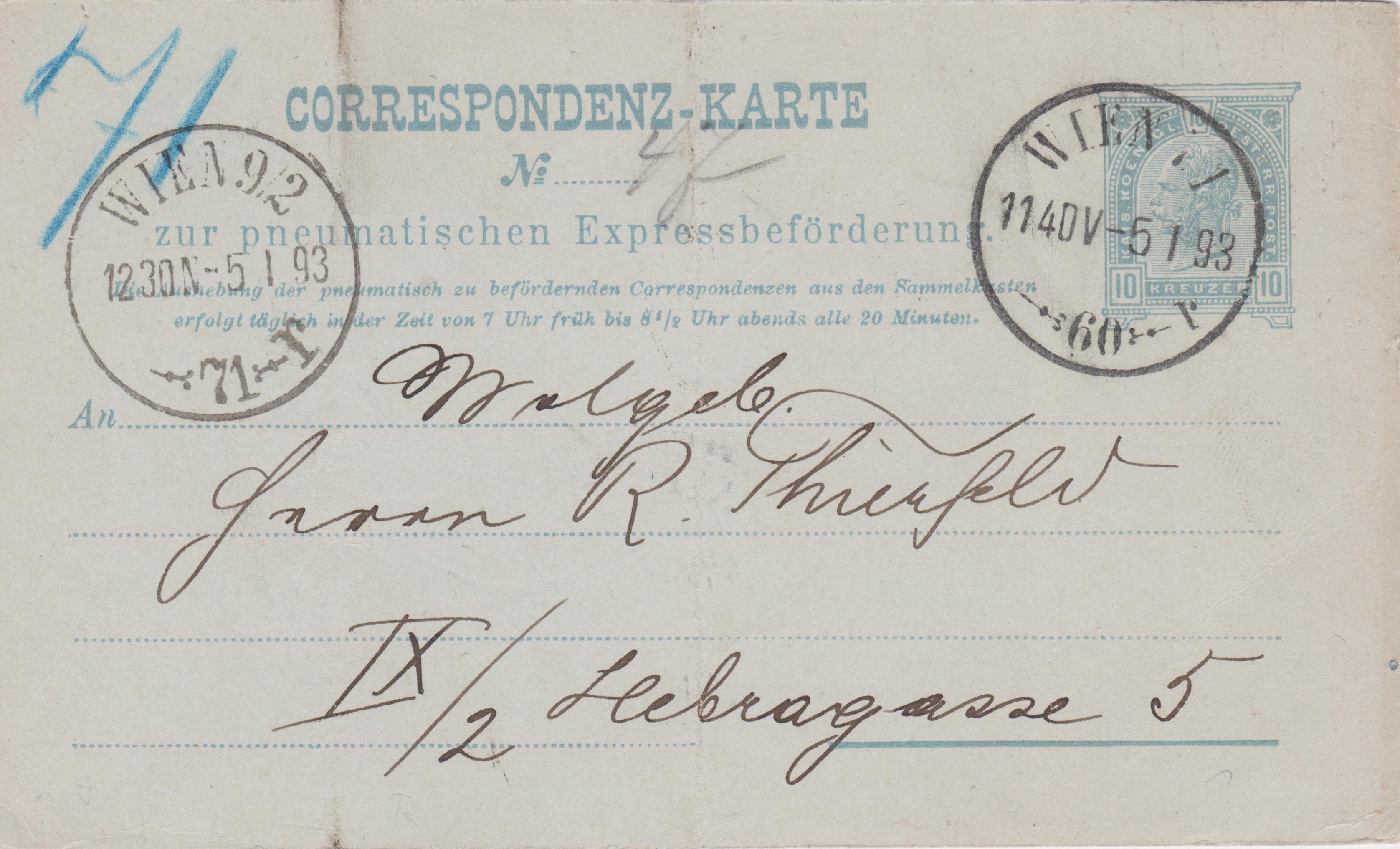 "CORRESPONDENZ-KARTE zur pneumatischen Expressbeförderung" gebaucht am 05.01.1893 von WIEN 60 nach WIEN 71:
