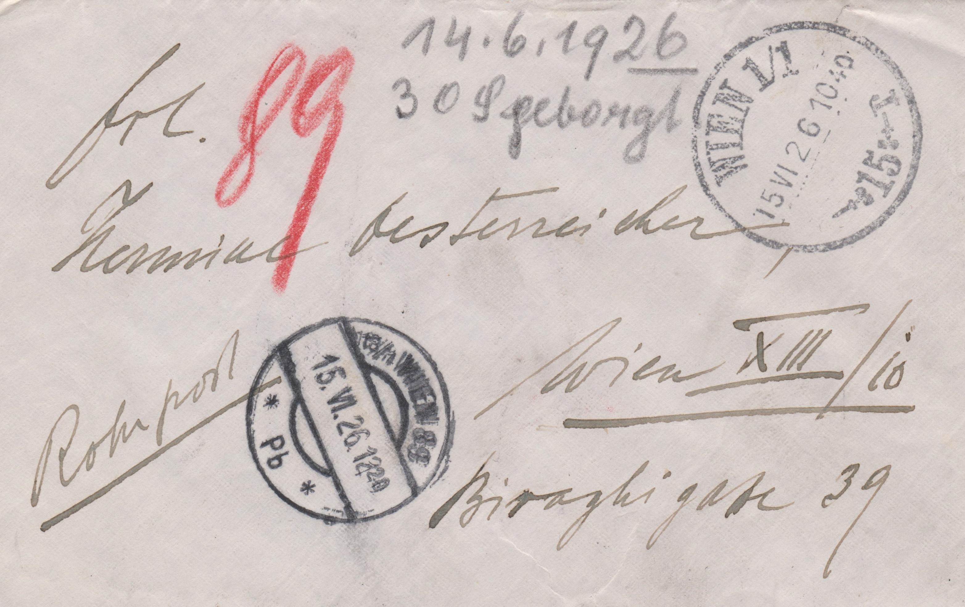 Brief "Rohrpost, adressiert nach "Wien, XIII", aufgegeben in "WIEN 1/1 15" am 15.06.1926 um 10 Uhr 40, befördert per Rohrpost nach "89" = WIEN 89, wo dieser Brief um "12 20" Uhr ankam: