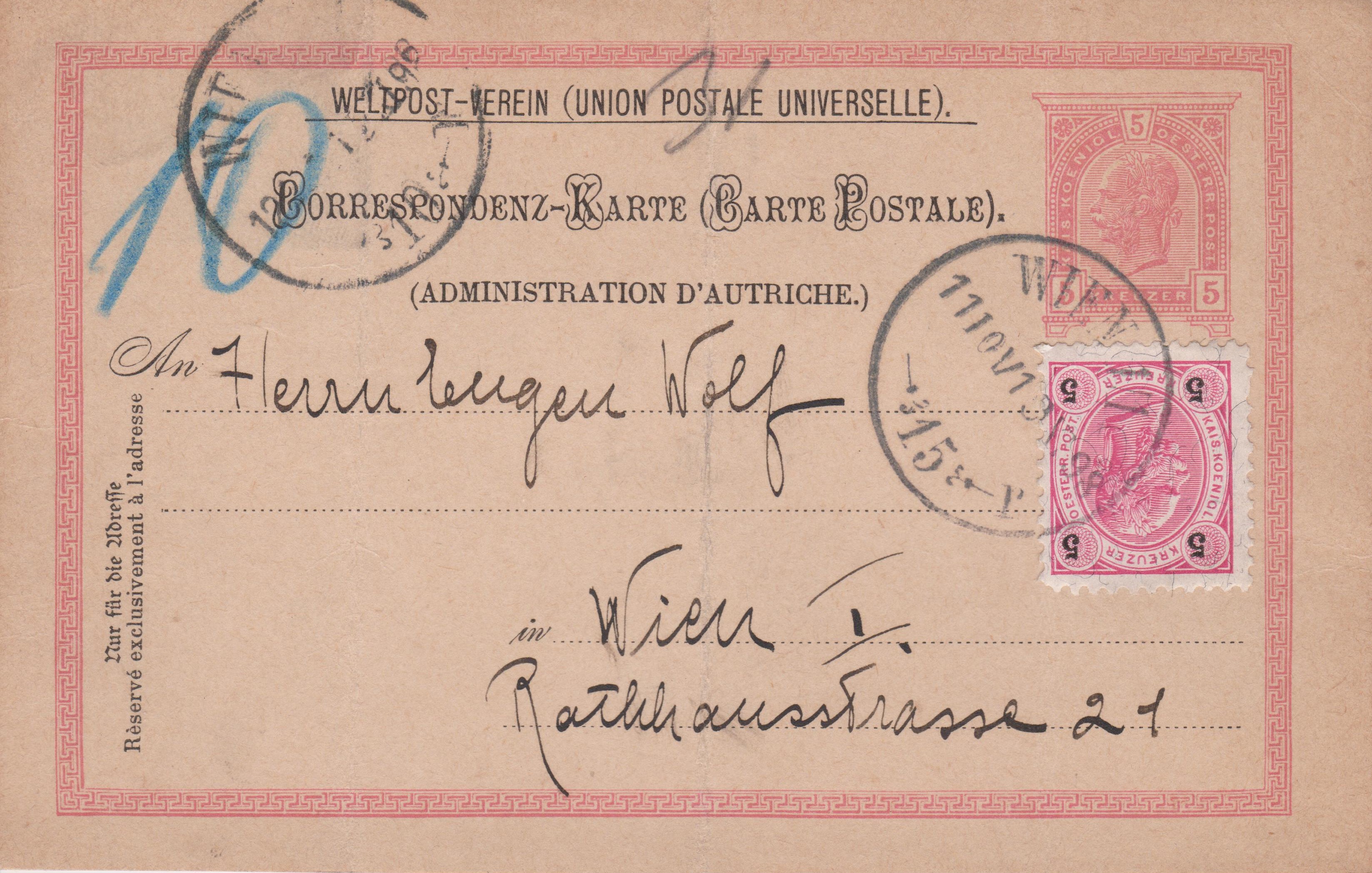 Diese Postkarte mit eingedrucktem Postwertzeichen der Wertstufe 5 KREUZER wurde mit einer Zusatzfrankatur von 5 Kreuzern versehen, um innerhalb von Wien per Rohrpost befördert zu werden: