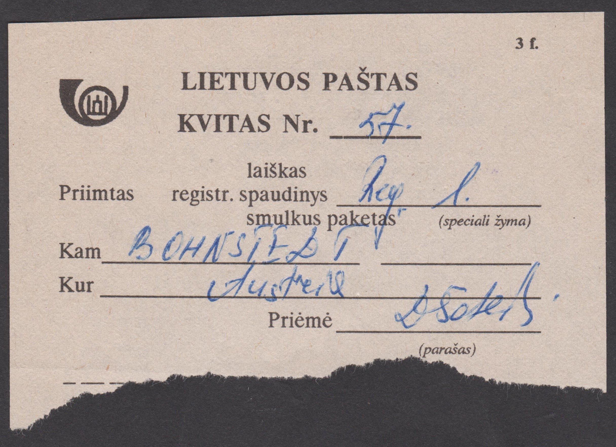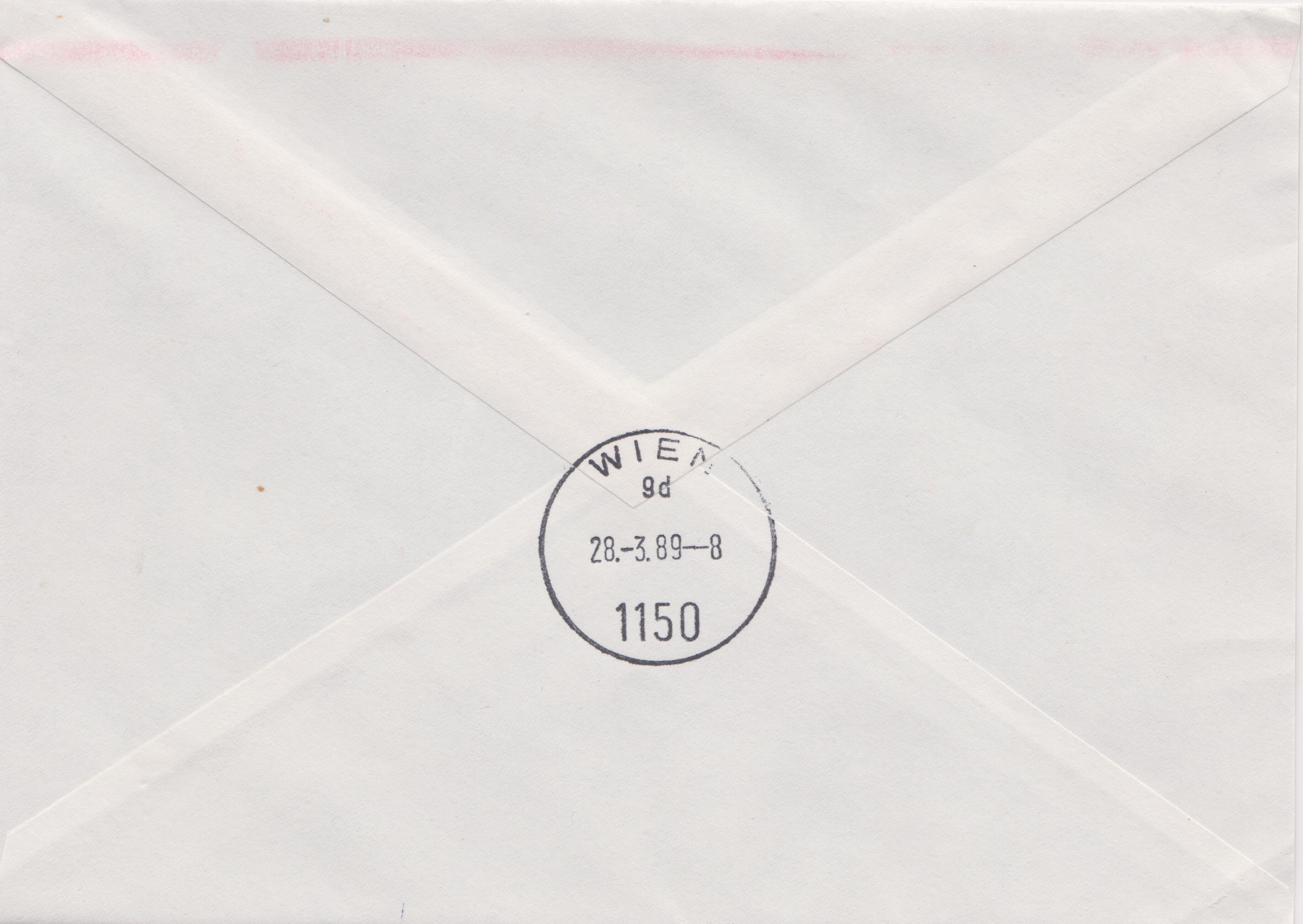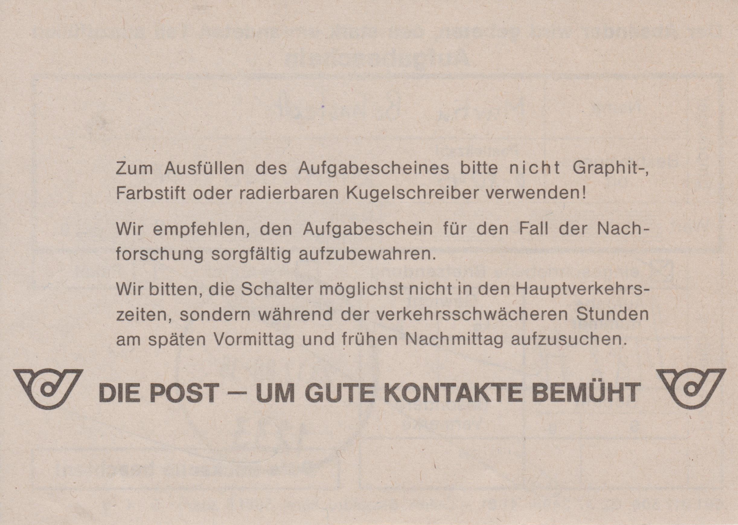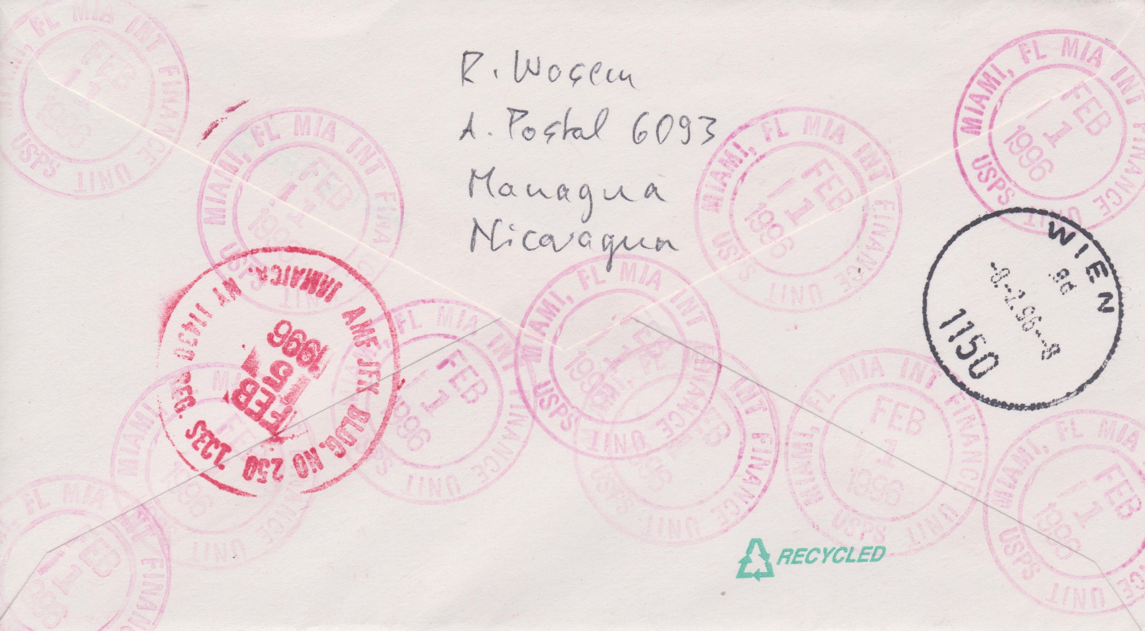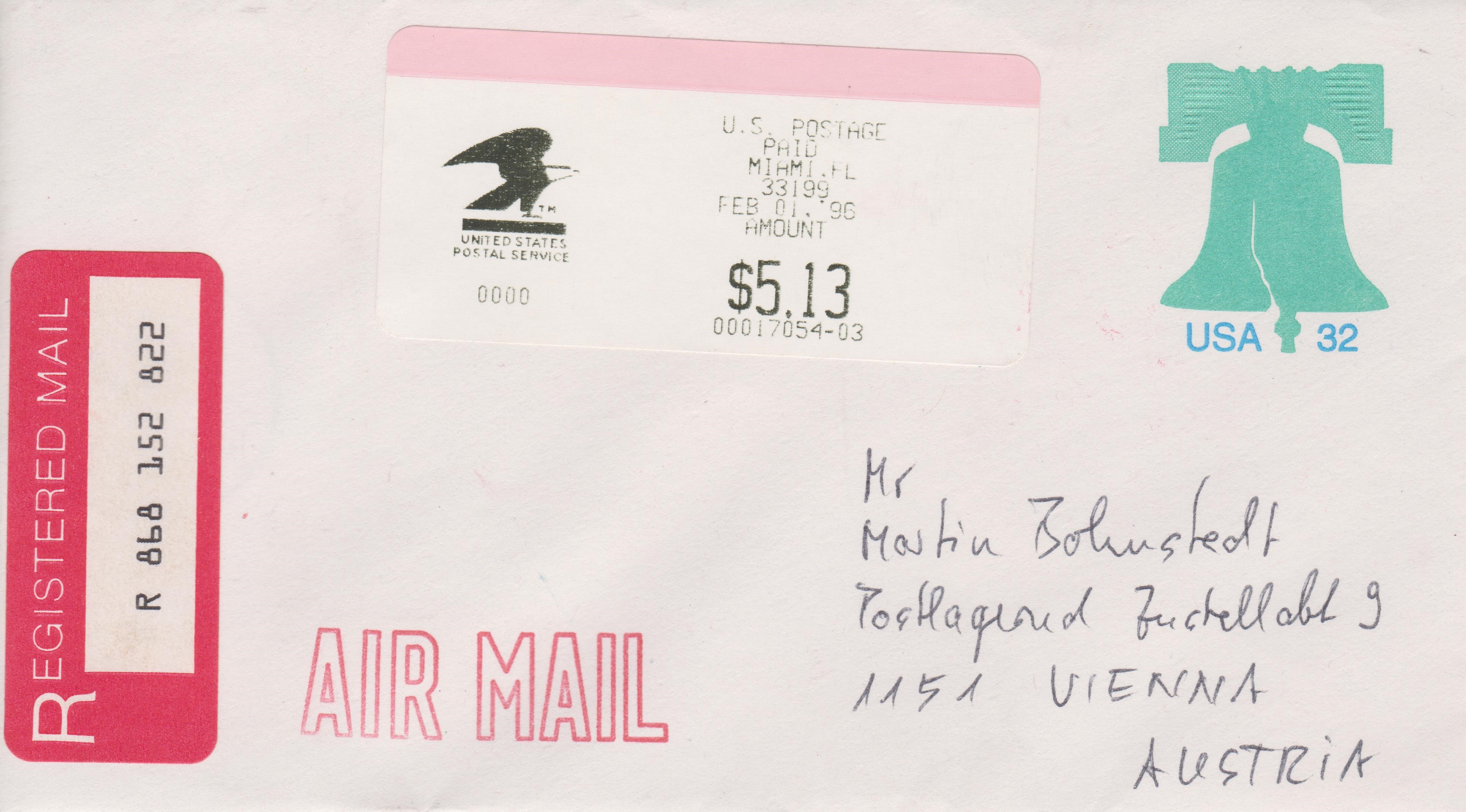 Einlieferungsschein zu einem eingeschriebenen Luftpostbrief nach Wien, Portostufe 60 US-Cents, Porto für ein Einschreiben 4,85 US-Dollar, aufgegeben am 01.02.1996 in MIAMI, FL (= Florida):