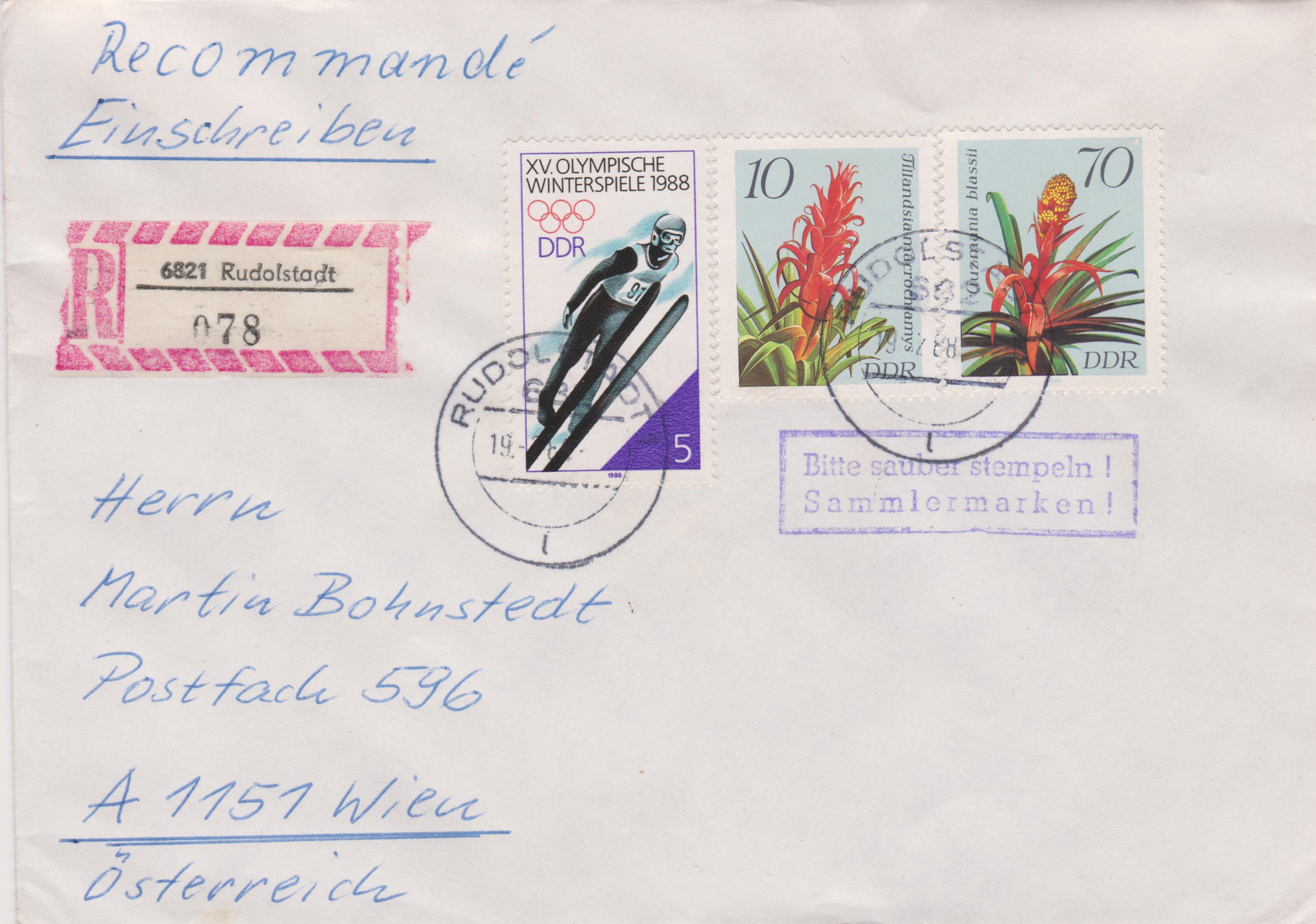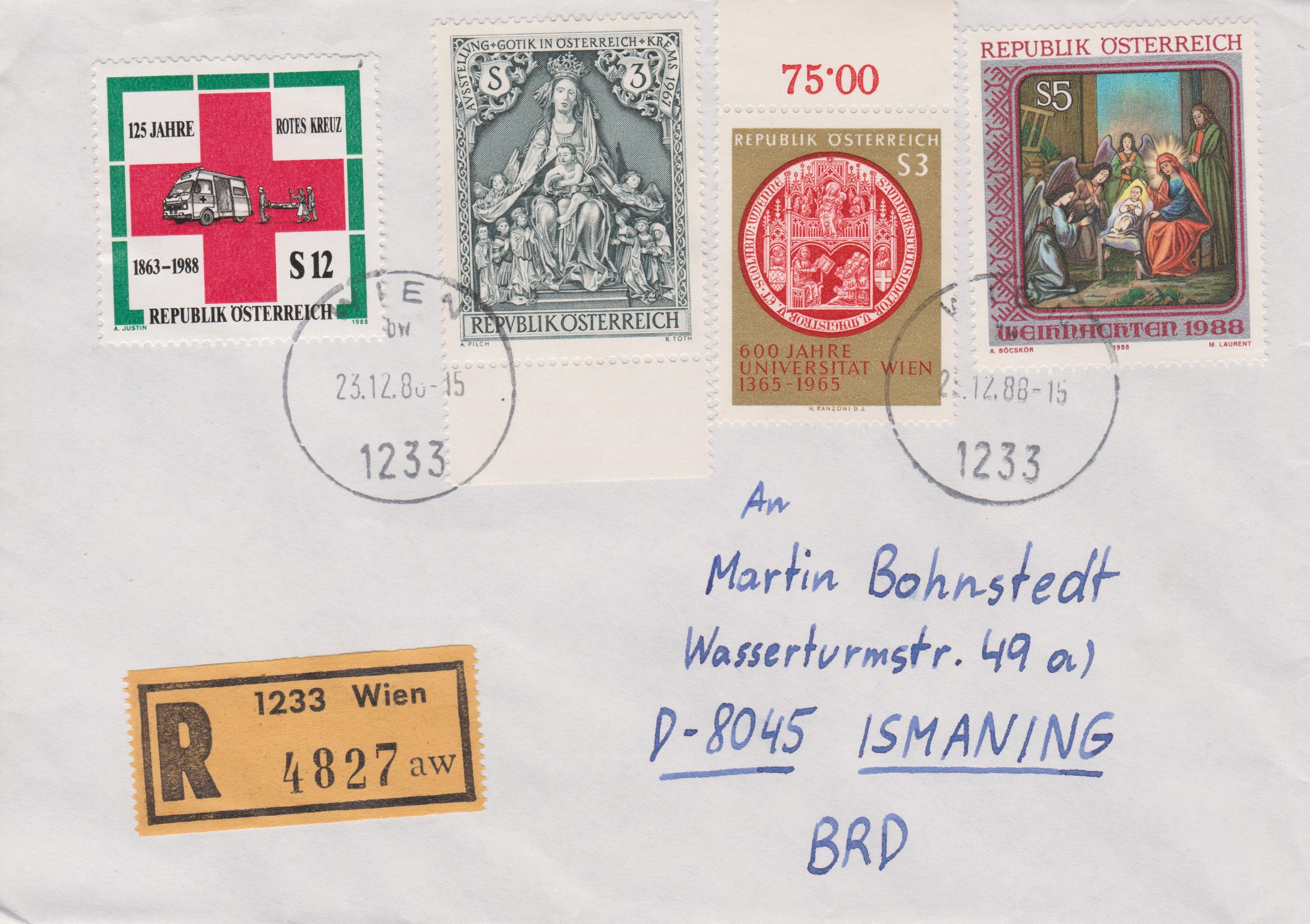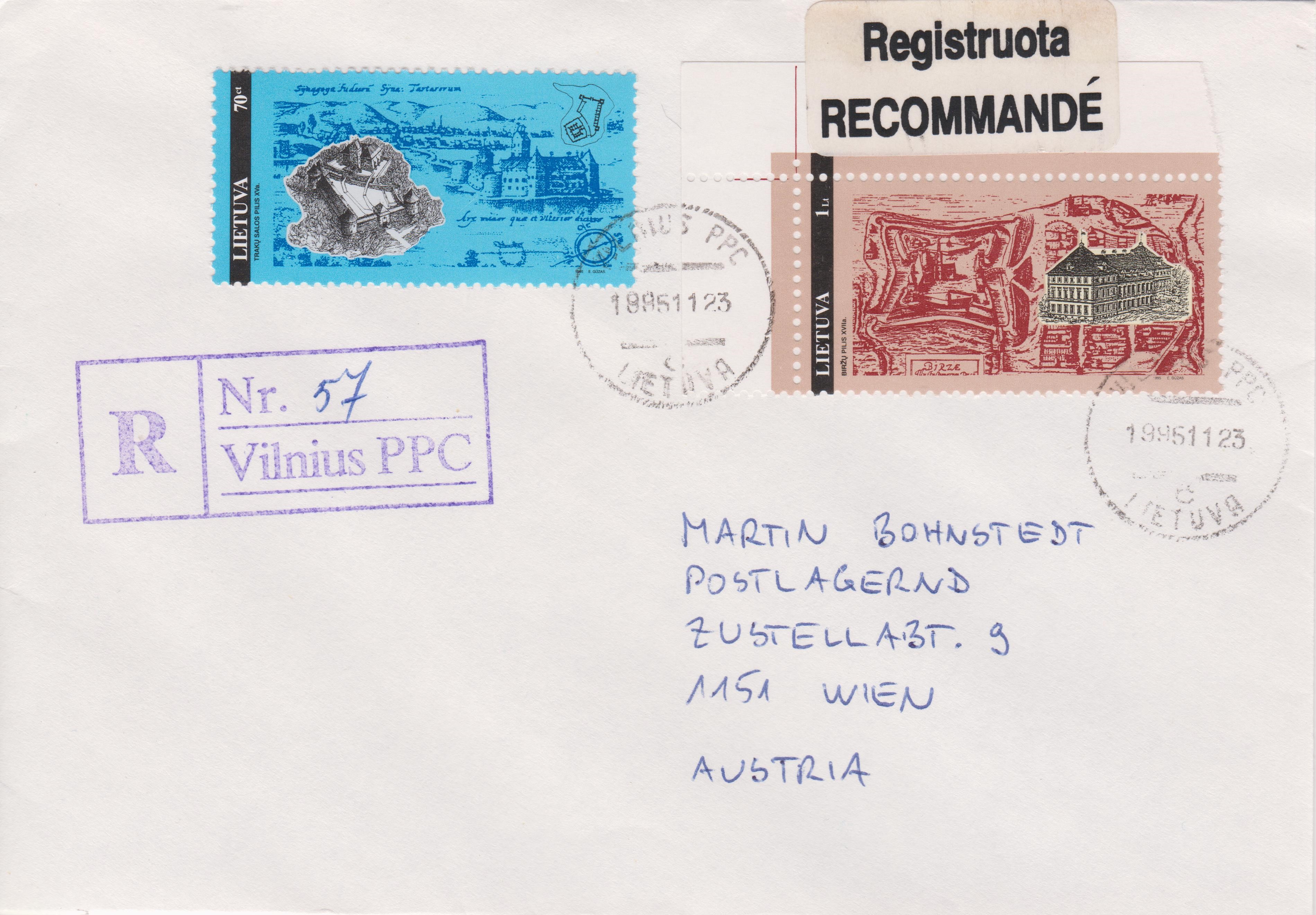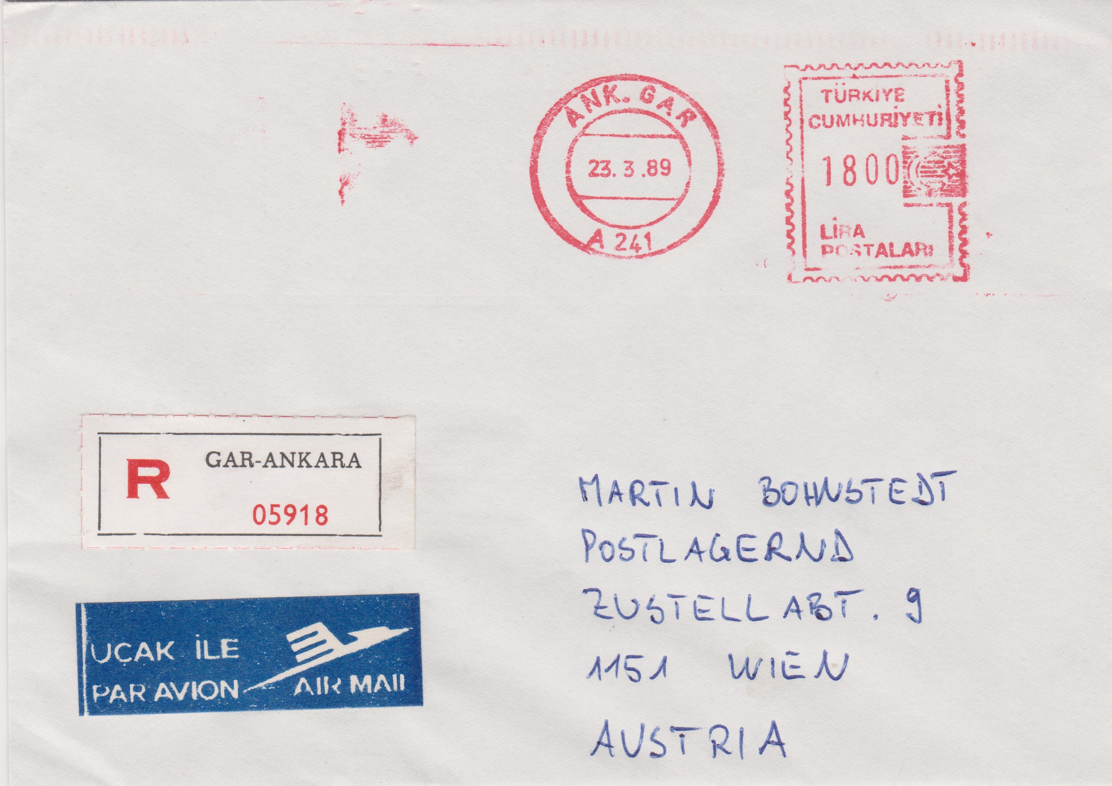 Einlieferungsschein zu einem eingeschriebenen Luftpostbrief nach Wien, Portostufe 60 US-Cents, Porto für ein Einschreiben 4,85 US-Dollar, aufgegeben am 01.02.1996 in MIAMI, FL (= Florida):