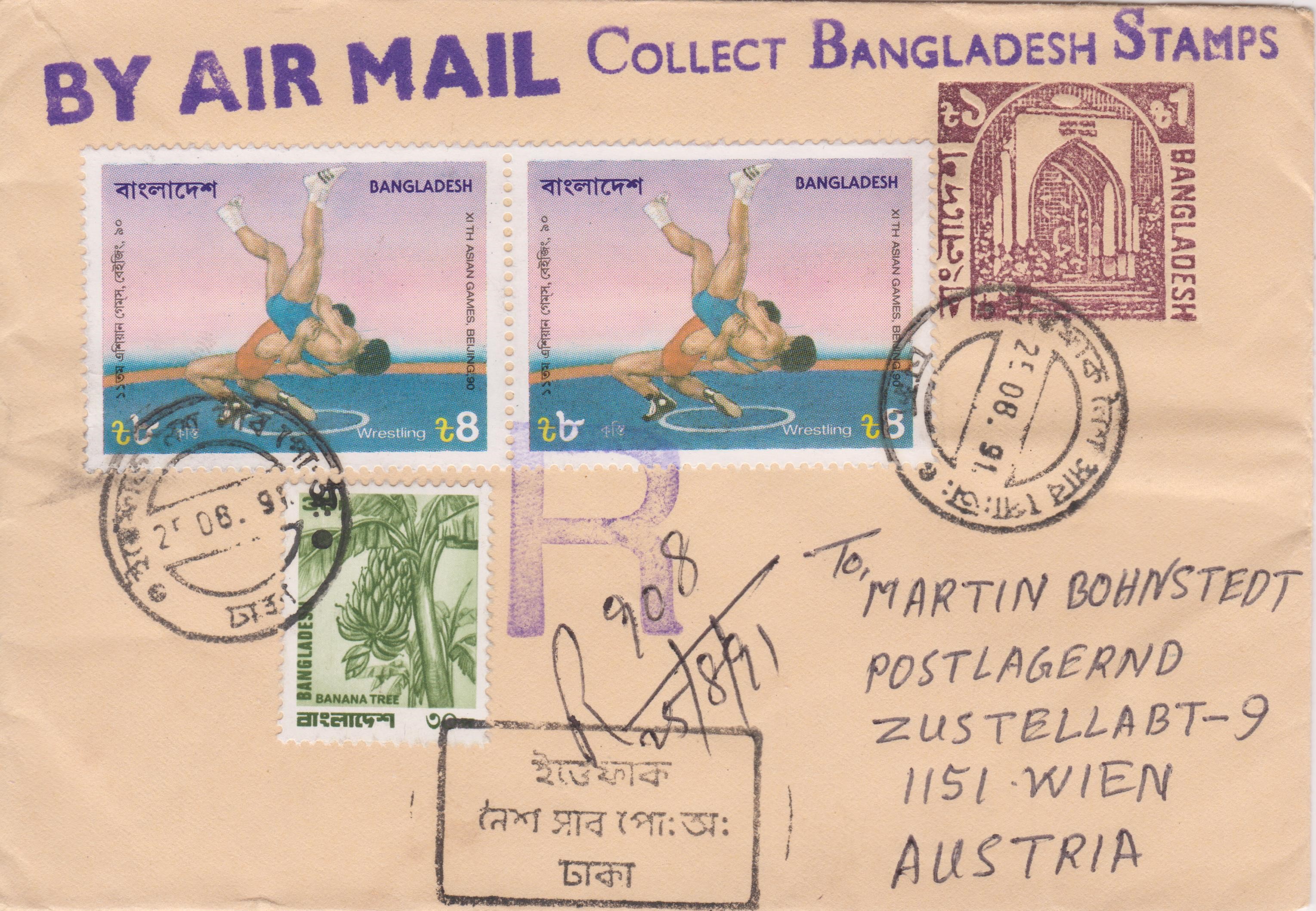 Da eine Ganzsache mit eingedrucktem Postwertzeichen zu 32 US-Cents verwendet wurde erfolgte die restliche Frankatur von 5,13 US-Dollar durch einen Aufkleber: