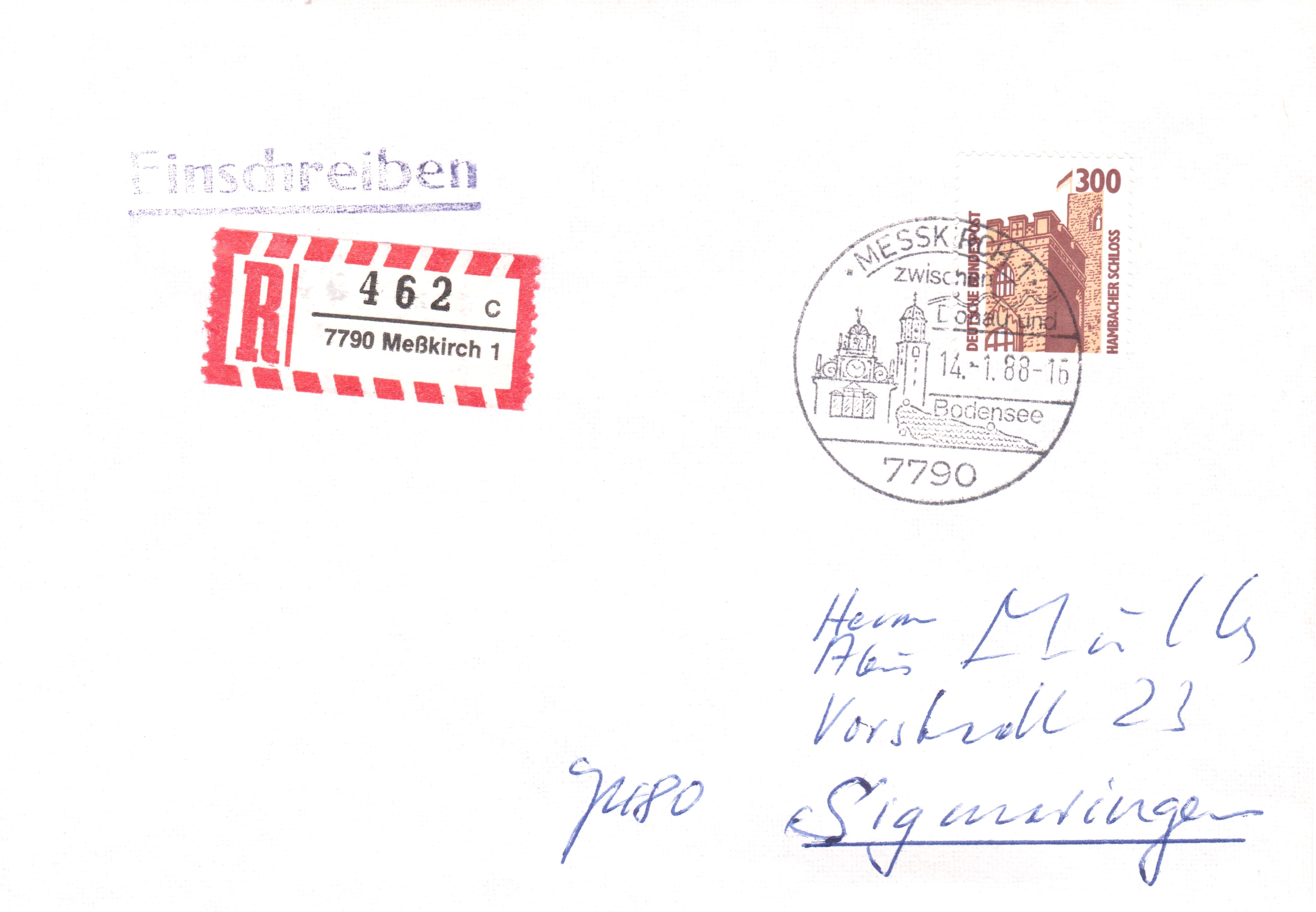 Dieser per Einschreiben aufgegebene Brief vom 14.01.1988 (= Erstausgabetag der Bund MiNr. 1348 Au) zeigt auf dem R-Zettel die Schreibweise "Meßkirch", im Handwerbestempel jedoch die Schreibweise "MESSKIRCH":