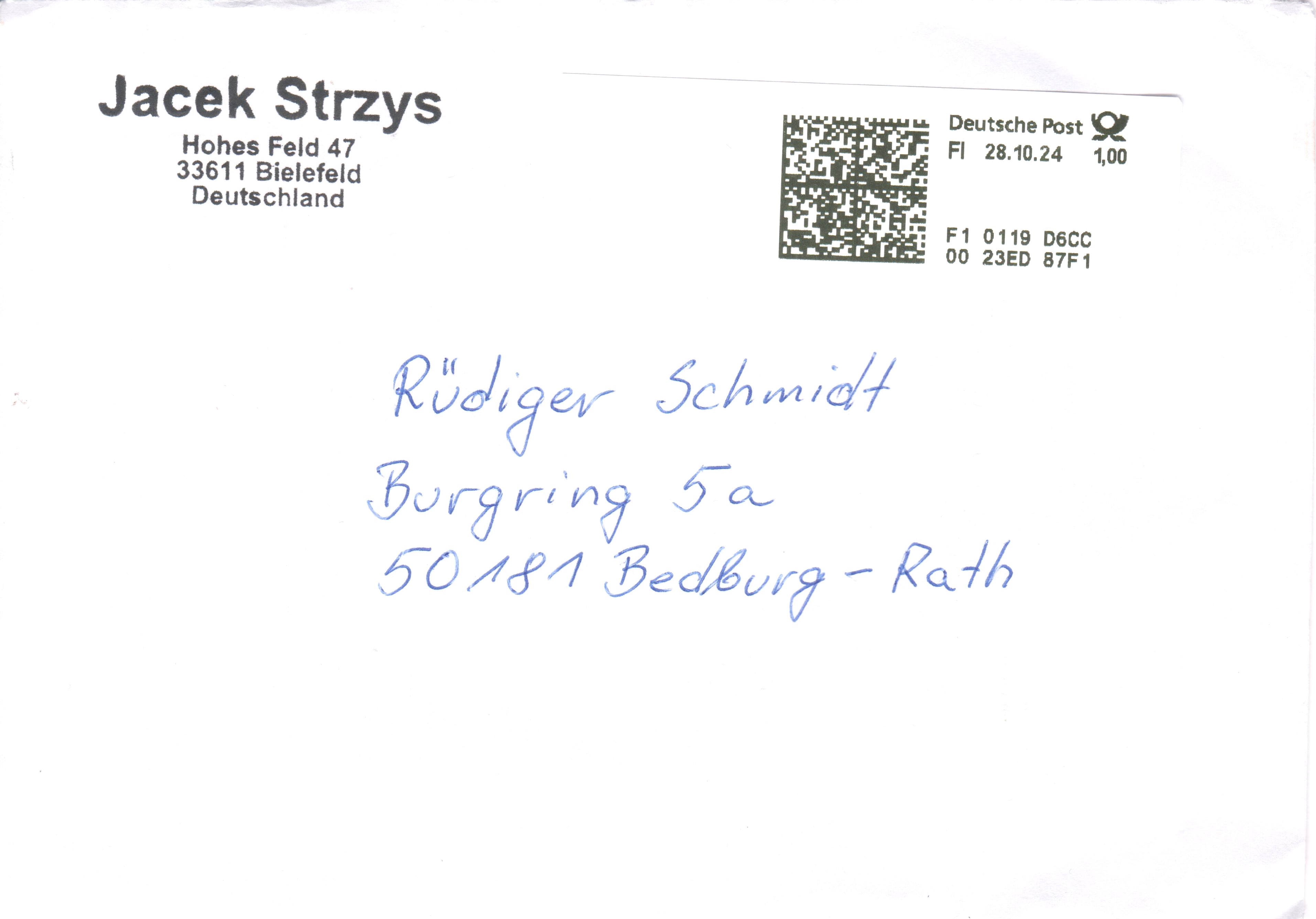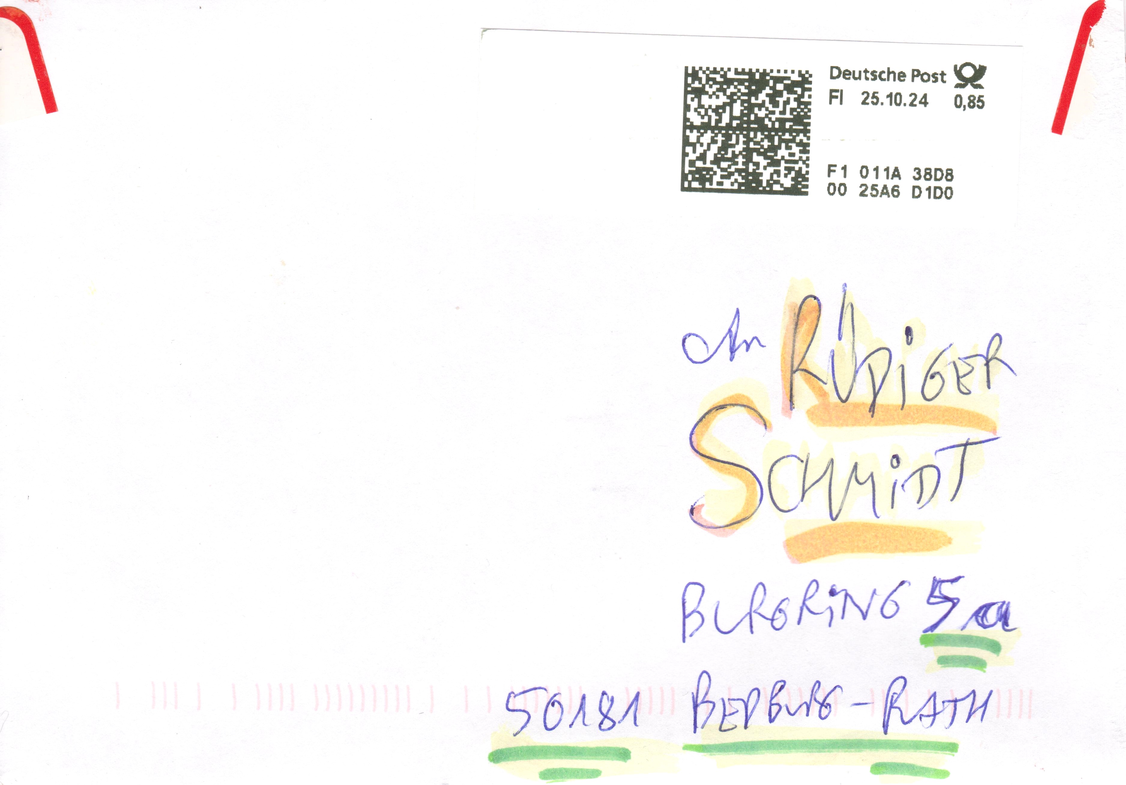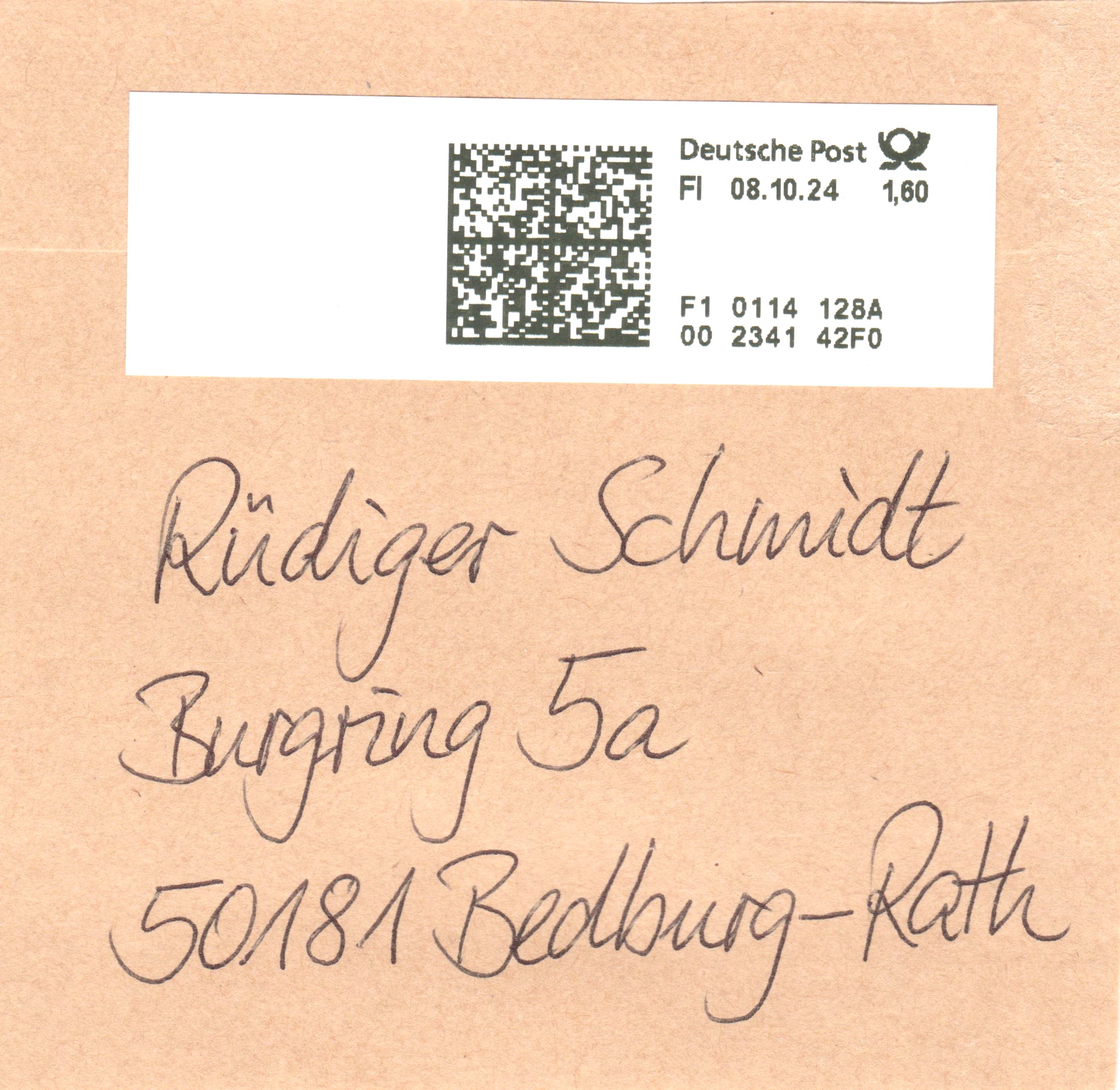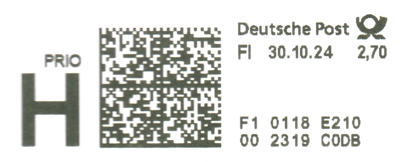 Dieser Brief der Portostufe 3,35 € wurde am 30.10.2024 in einer Postfiliale "Fl" aufgegeben: