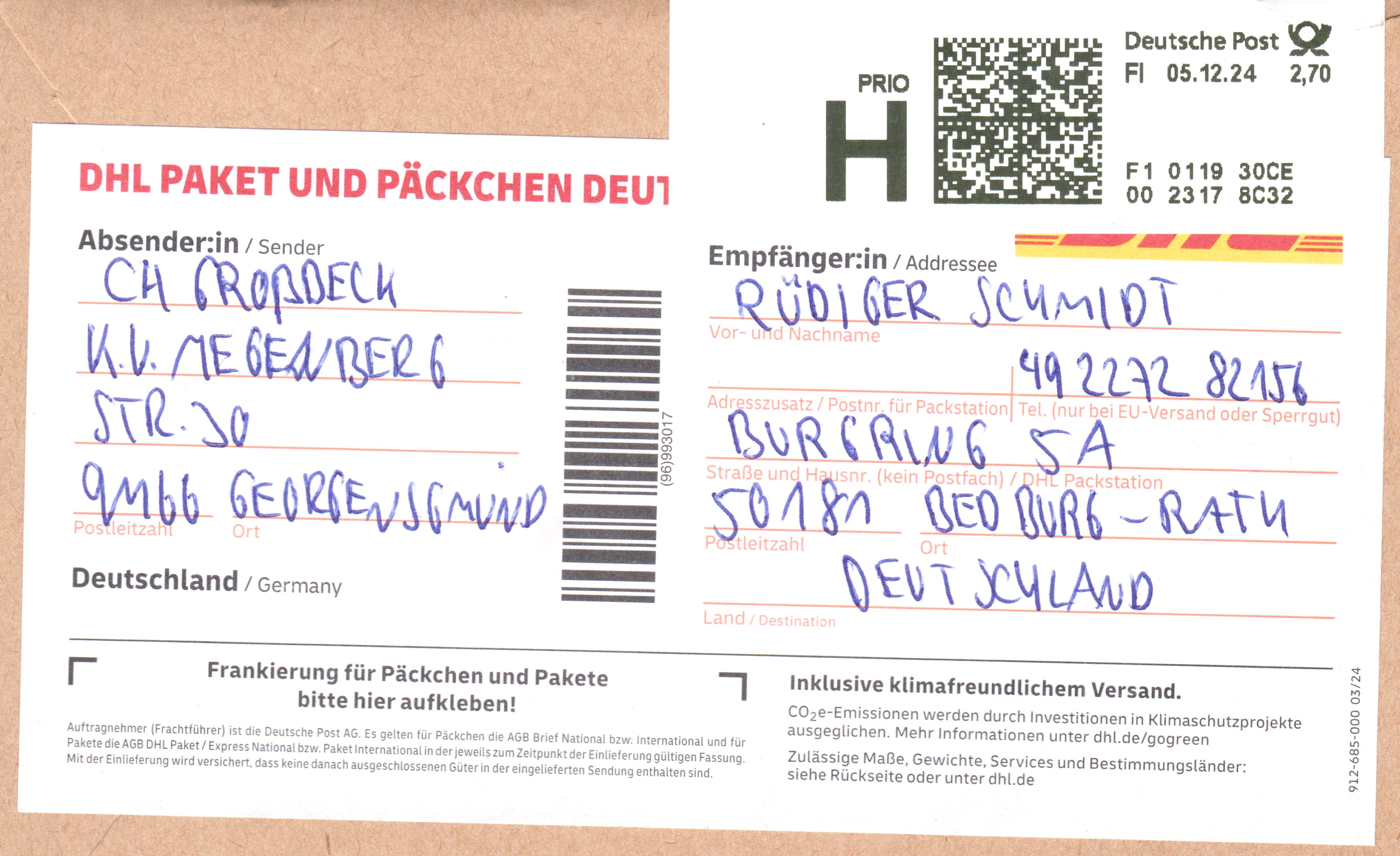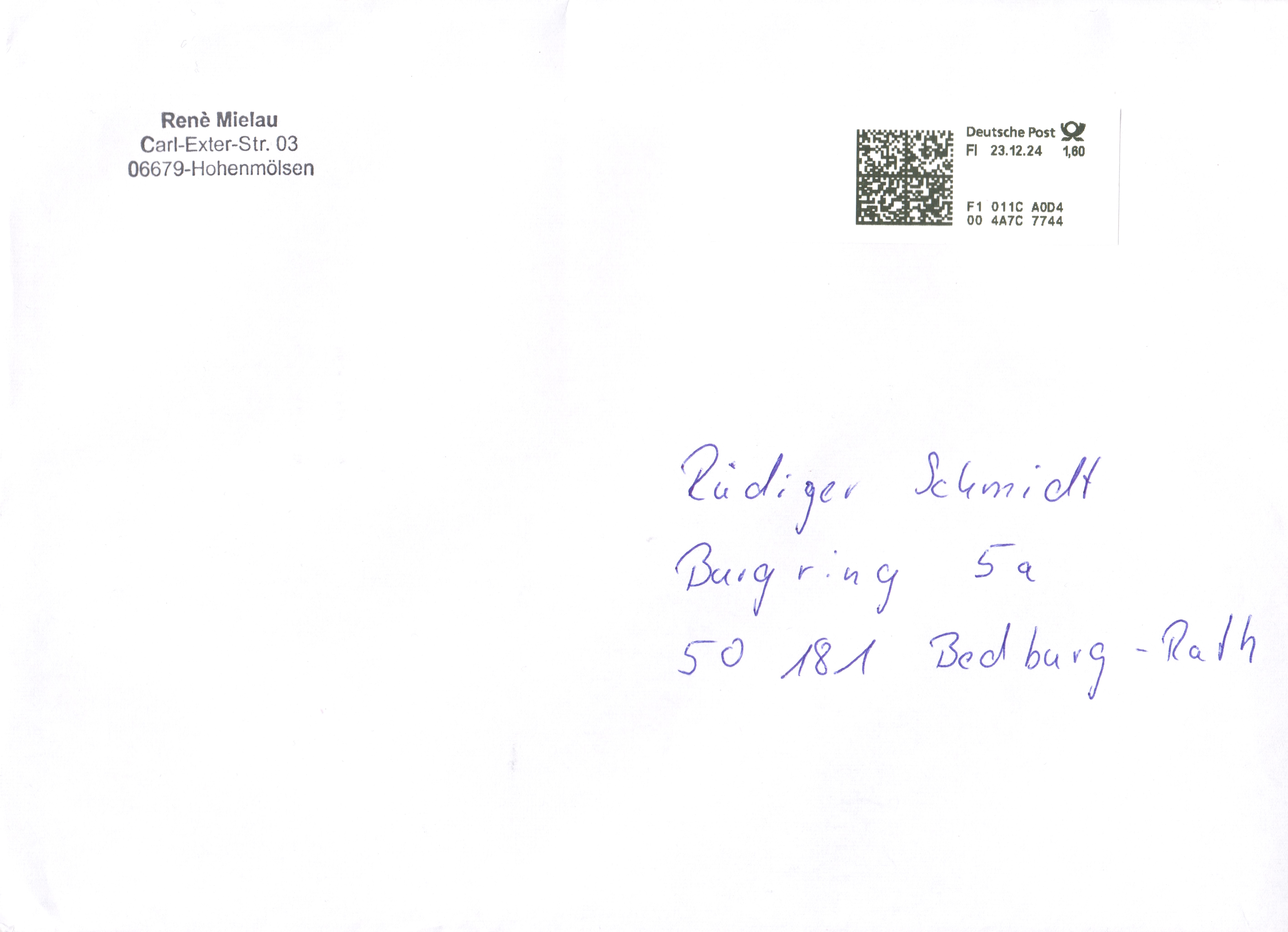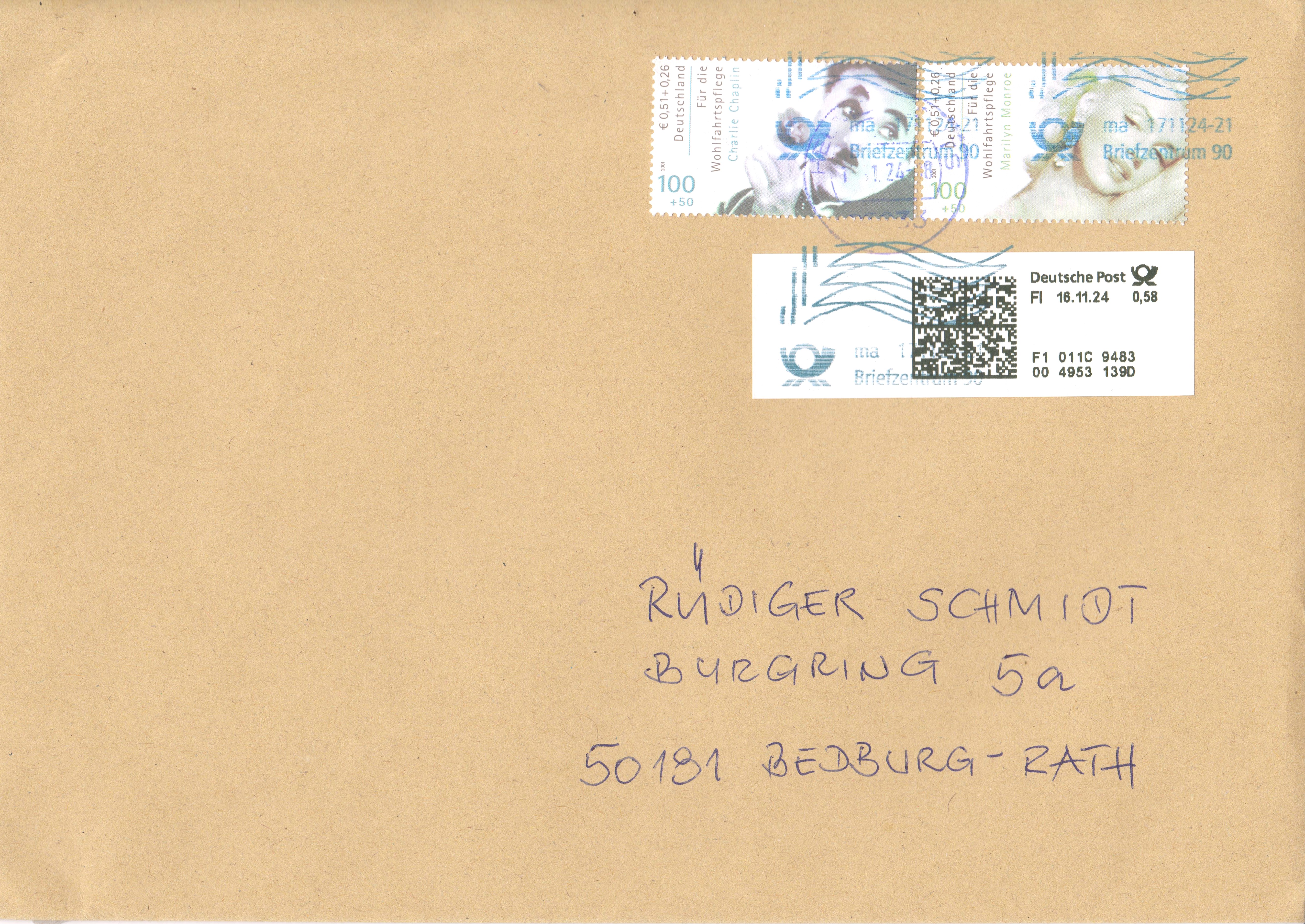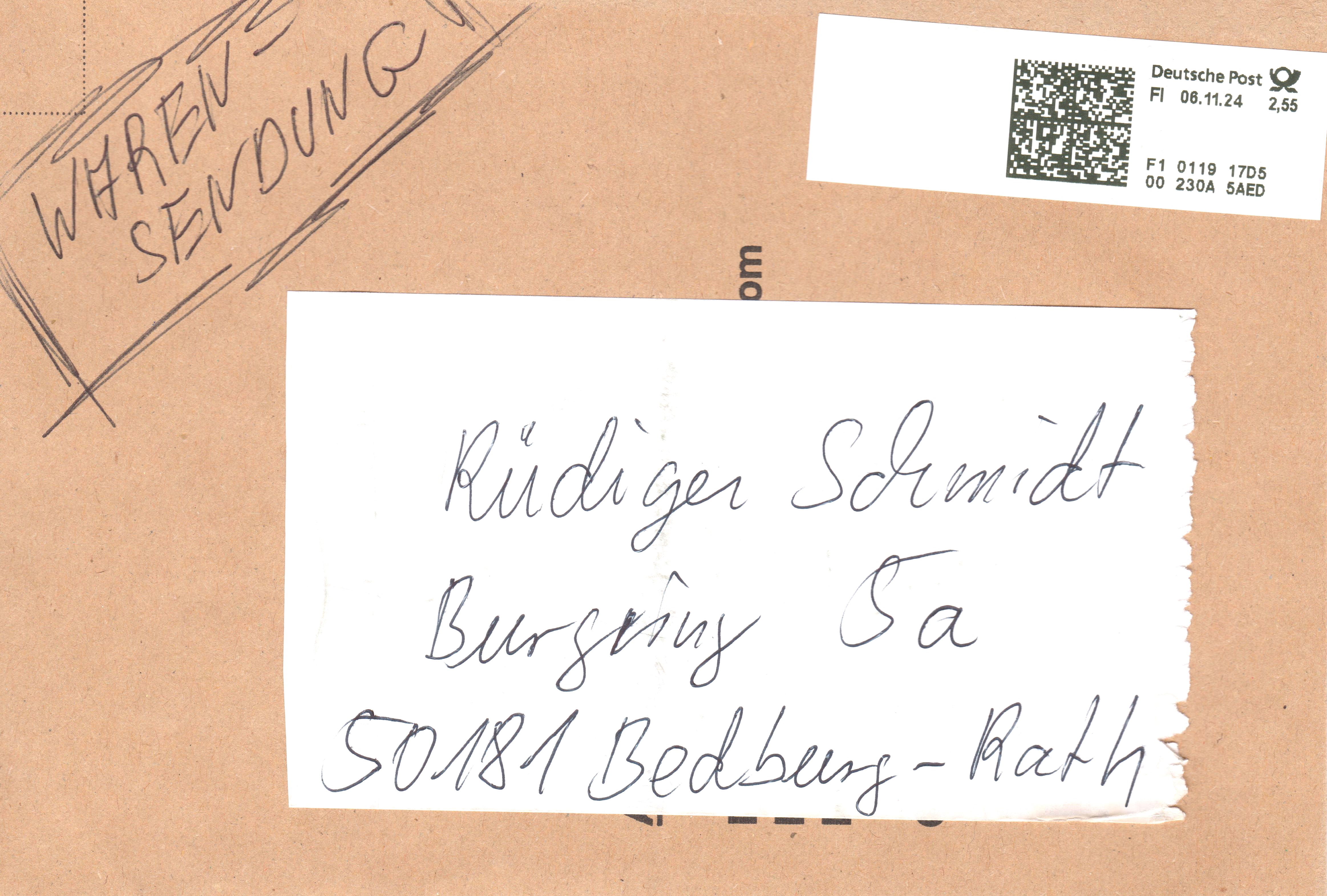 Dieser Brief der Portostufe 3,35 € wurde am 30.10.2024 in einer Postfiliale "Fl" aufgegeben:
