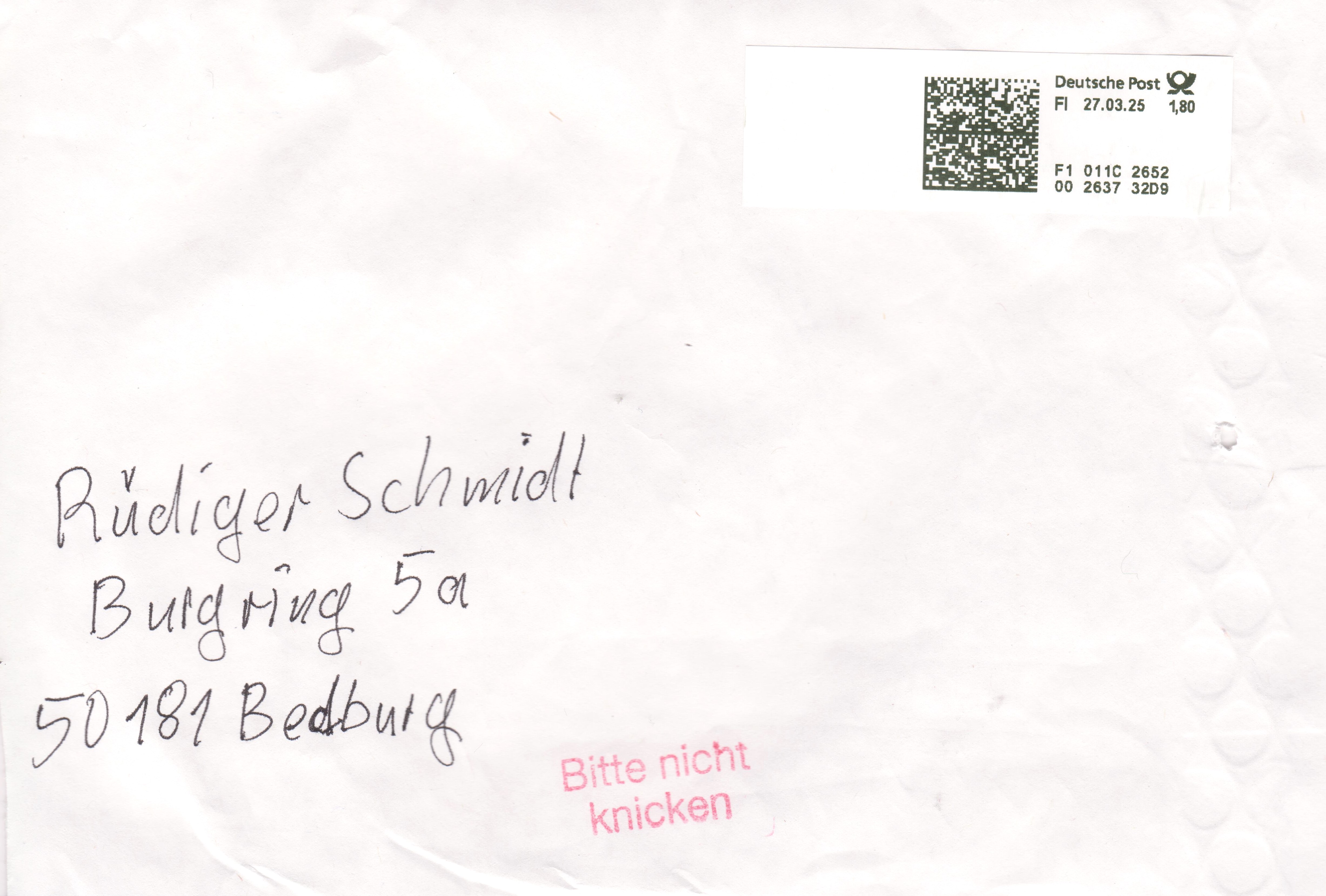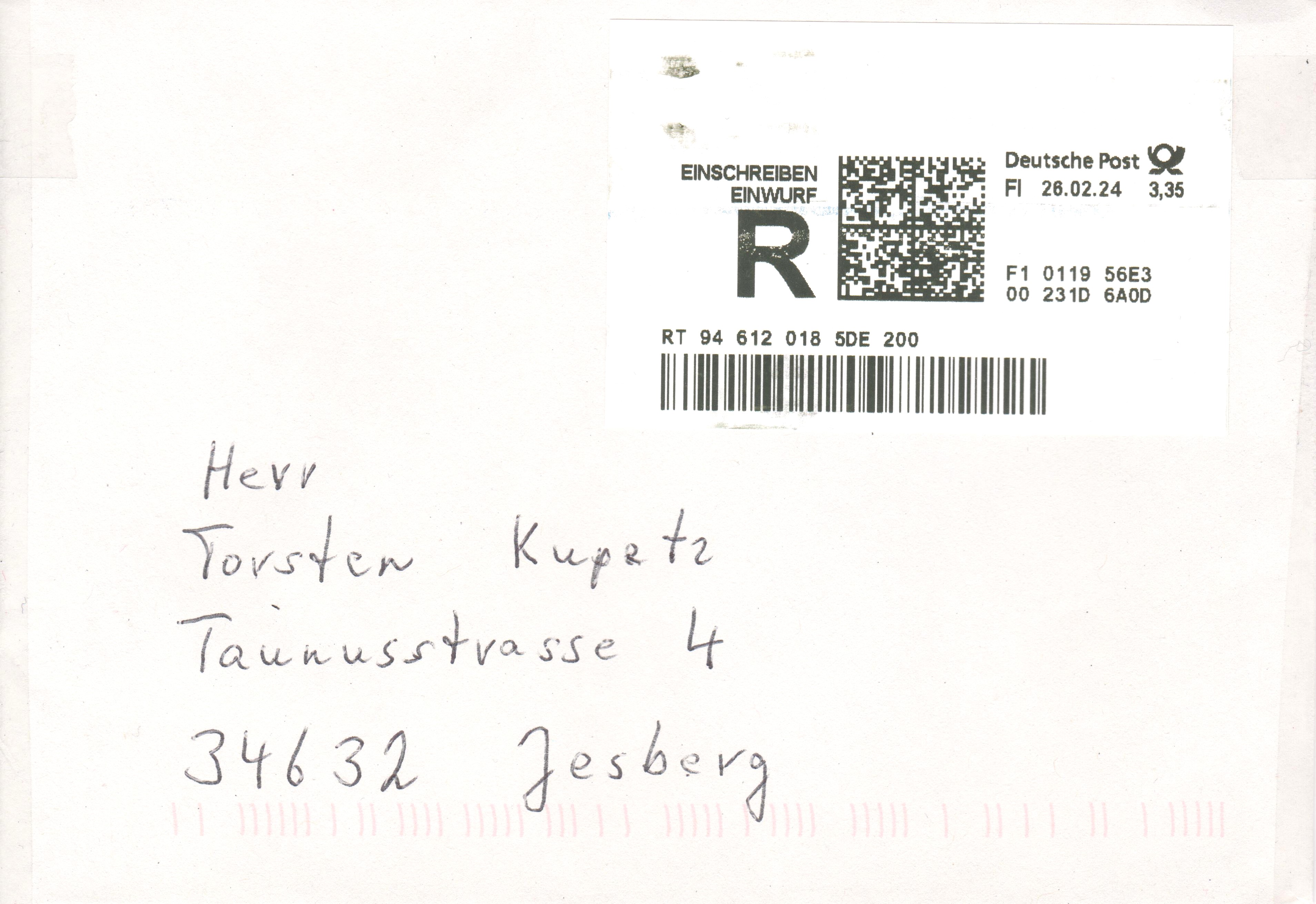 Dieser Brief der Portostufe 3,35 € wurde am 26.02.2024 in einer Postfiliale "Fl" aufgegeben: