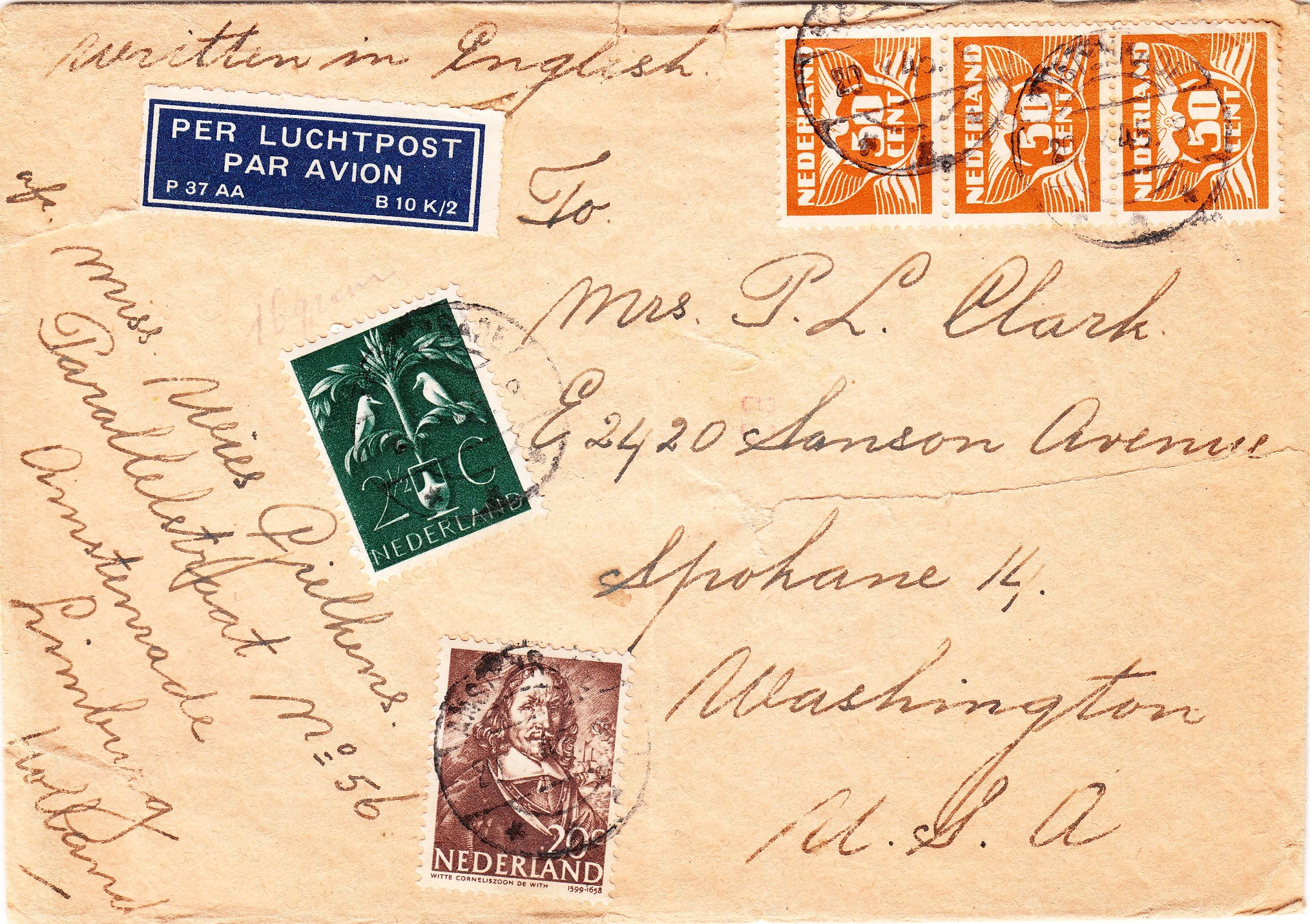 Dieser nach Washington in den USA adressierte Brief wurde am 20.09.1945 in Amstenrade/Limburg aufgegeben: