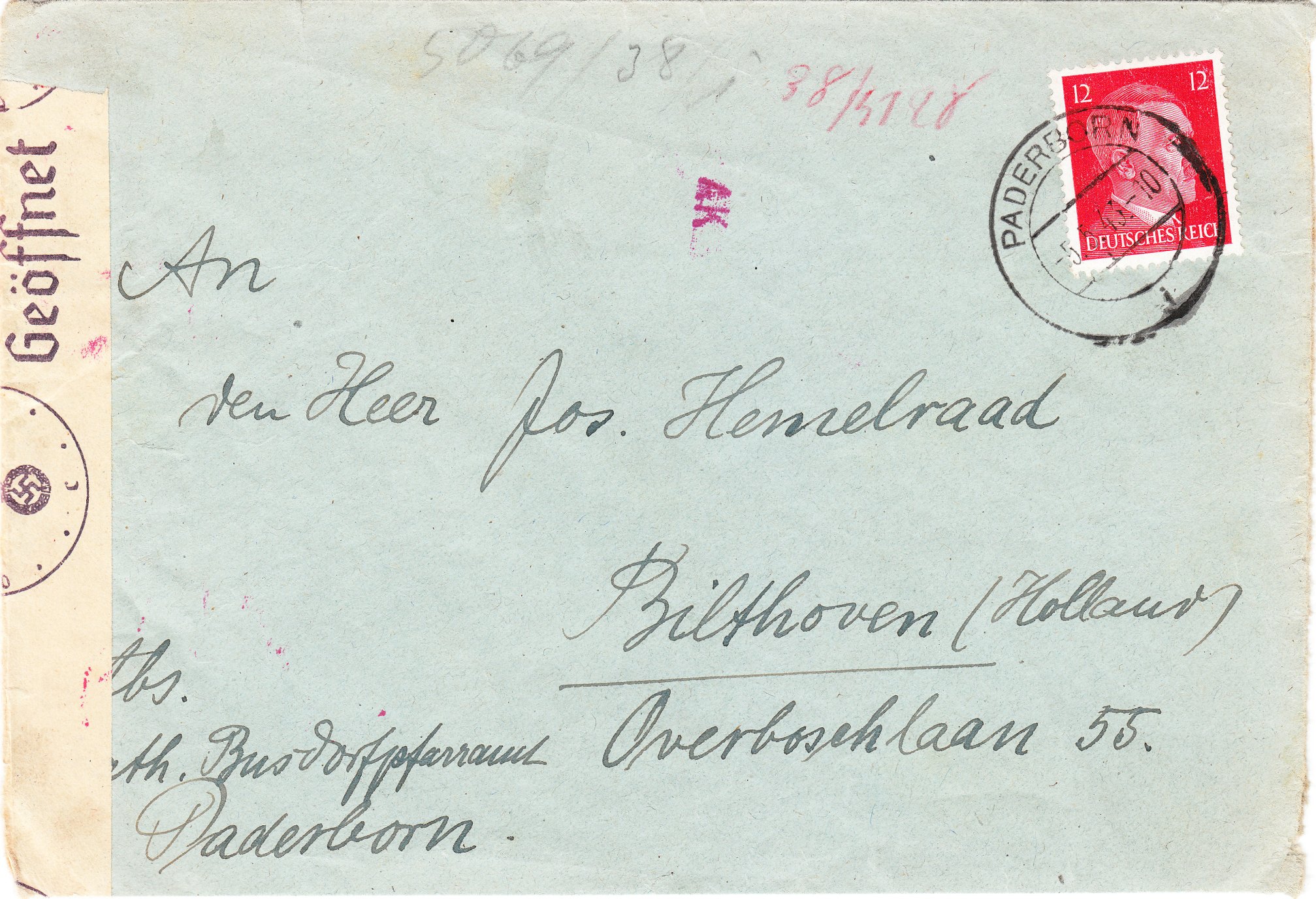 Dieser nach Holland adressierte Brief wurde zum Inlandstarif von 12 Pfennig frankiert am 05.05.1943 in Paderborn aufgegeben.-