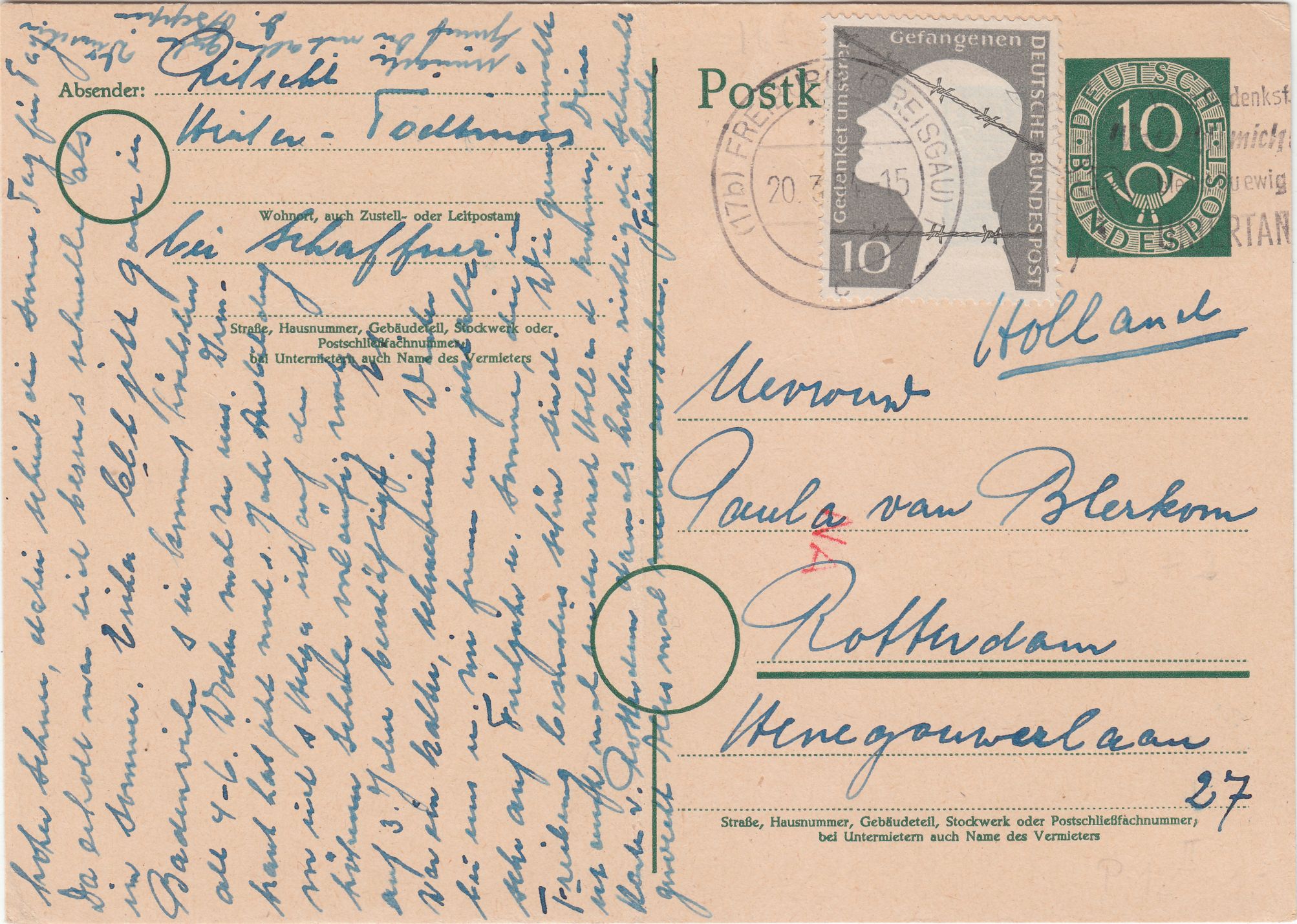 In Holland erfolgte eine recht selten zu findende TRANSORMA-Codierung "AK". In den Niederlanden wurden insgesamt 20 Transorma-Sortiermaschinen in Betrieb genommen. Dieser nach Bilthoven adressierte Beleg erhielt seine Transorma-Codierung in Utrecht, da Bilthoven in der Provinz Utrecht liegt und Utrecht die Operatorkennungen "AA" bis "BL" benutzte. Es handelte sich somit in diesem Falle um eine Eingangscodierung per TRANSORMA!