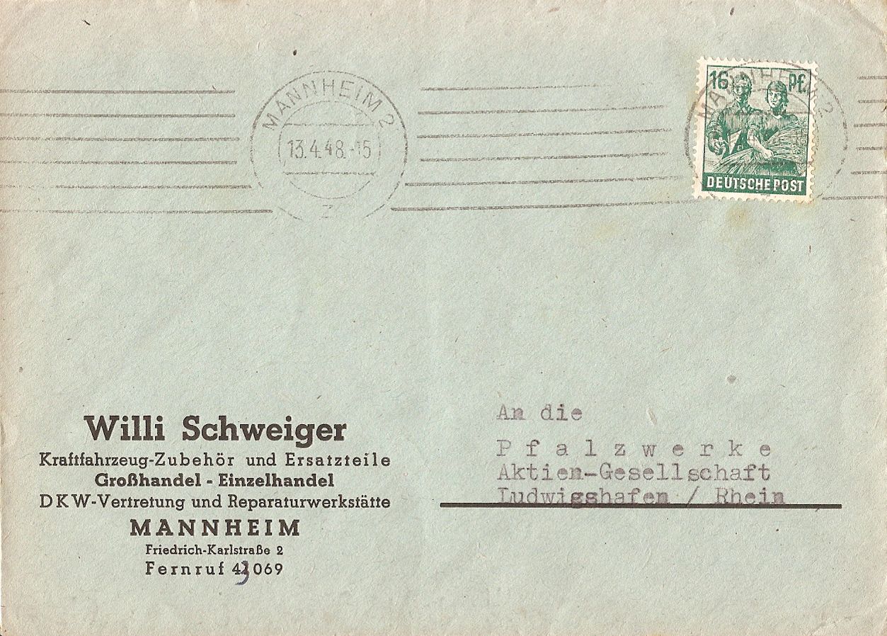 Als Beispiel für den vergünstigten Nachbarortverkehr möchte ich einen Brief von Mannheim nach Ludwigshafen während der Zeit des alliierten Kontrollrats zeigen. Der Brief wurde portogerecht mit 16 Pfennig frankiert und am 13.4.48 in Mannheim mit einem Maschinenstempel abgestempelt.