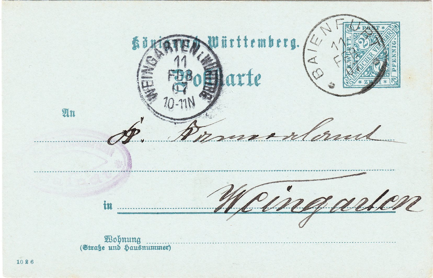 Diese Postkarte mit Eindruck eines 2 Pf Wertes "AMTLICHER VERKEHR" lief am 11.02.1907 von BAIENFURT nach Weingarten. Diese beiden Orte liegen nur 2 km auseinander und somit innerhalb der 10 km-Grenze für den württembergischen Nachbarortsverkehr: