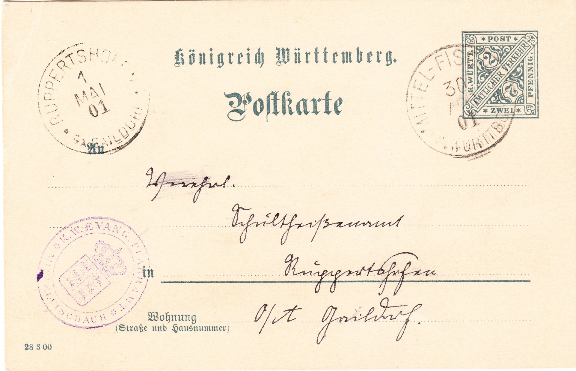 Diese Postkarte mit Eindruck eines 2 Pf Wertes "AMTLICHER VERKEHR" lief am 30.04.1901 von MITTEL-FISCHACH nach Ruppertshofen. Beide Orte waren dem Oberamt Gaildorf unterstellt und unterlagen somit dem Oberamtsverkehr zum Ortstarif: