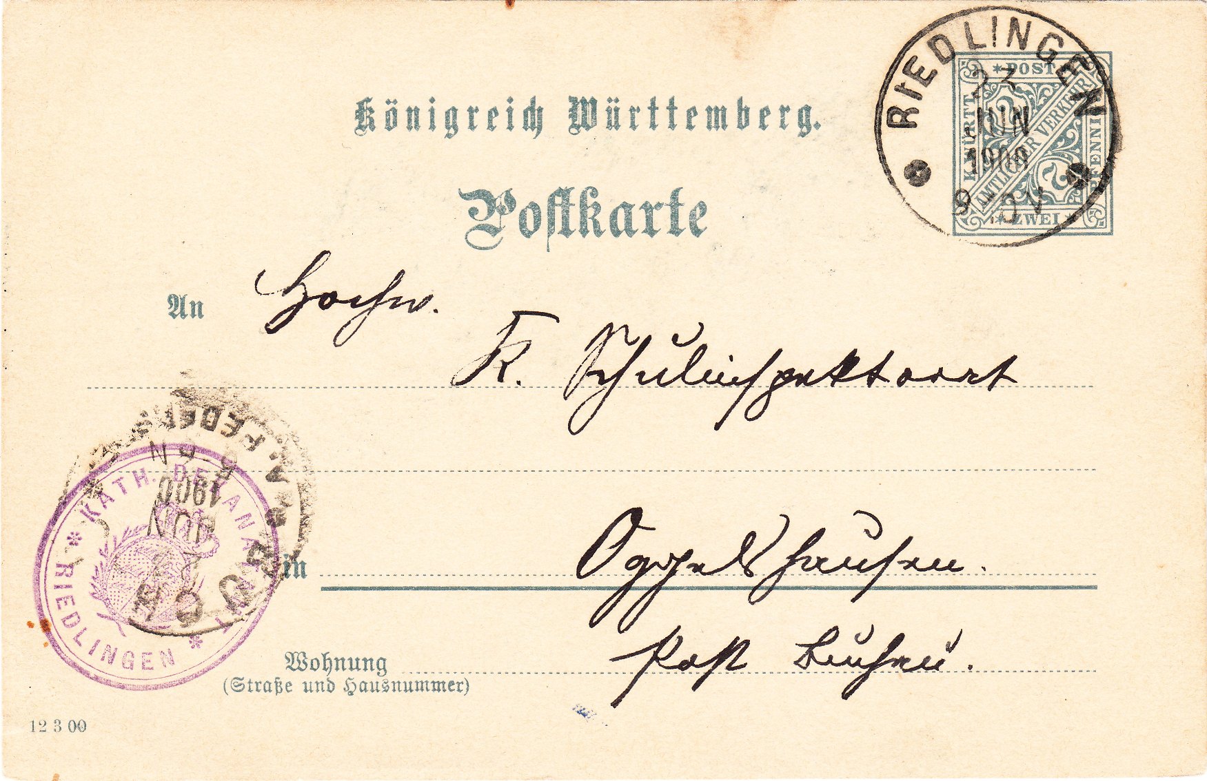 Diese Postkarte mit Eindruck eines 2 Pf Wertes "AMTLICHER VERKEHR" lief am 23.06.1900 von RIEDLINGEN nach "Oggelshausen Post Buchau". Beide Orte waren dem Oberamt Riedlingen unterstellt und unterlagen somit dem Oberamtsverkehr:
