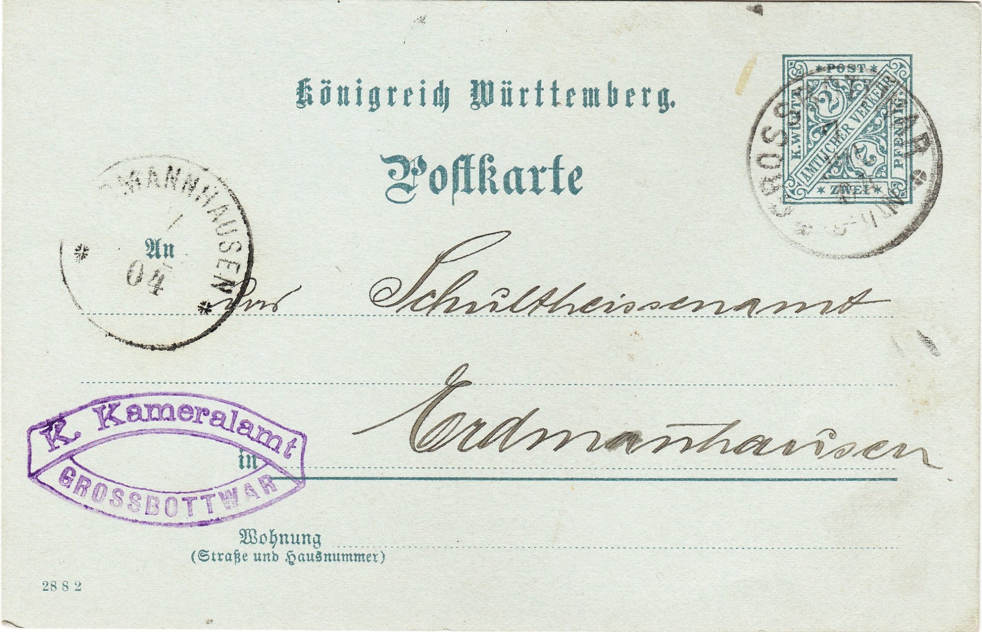 Diese Postkarte mit Eindruck eines 2 Pf Wertes "AMTLICHER VERKEHR" lief am 07.07.1904 von GROSSBOTTWAR nach ERDMANNSHAUSEN. Beide Orte waren damals dem Oberamt Marbach unterstellt und unterlagen somit dem württembergischen Oberamtsverkehr: