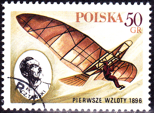 Auf dieser Marke aus Polen (MiNr 2551) werden ein Porträt von Czesław Tański und eine Abbildung bei seinem ersten Flugversuch 1896 in Janów Podlaski gezeigt.