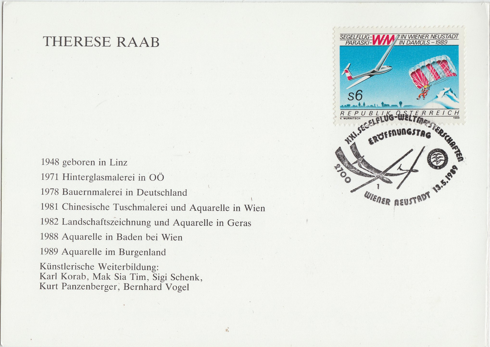 Mit dieser Klappkarte lud das Organisationskomitee der XXI. Segelflug-Weltmeisterschaften für den 13.05.1989 namentlich zur Ausstellungseröffnung "80 Jahre Flugplatz Wiener Neustadt" in die Karmeliterkirche in Wiener Neustadt ein: