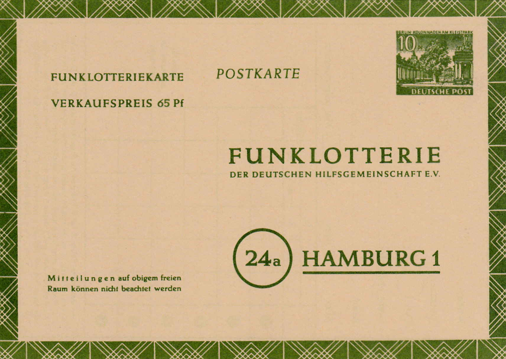 Funklotterie-Postkarte (MiNr FP 4) mit Werteindruck 10Pf "Kolonnaden am Kleistpark".