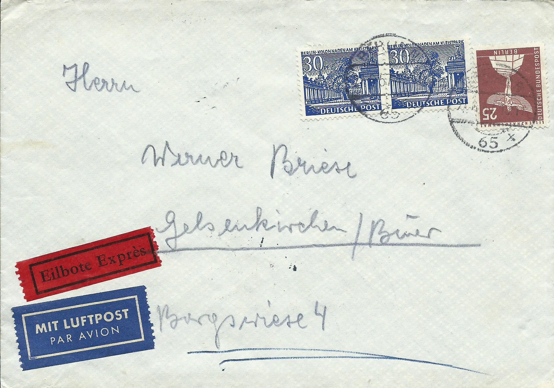 hier kann ich einen Beleg mit einem waagrechten Paar zu 30 Pf nebst Beifrankatur zeigen. Gestempelt wurde der Beleg in Berlin-N 65 am 27.6.57.