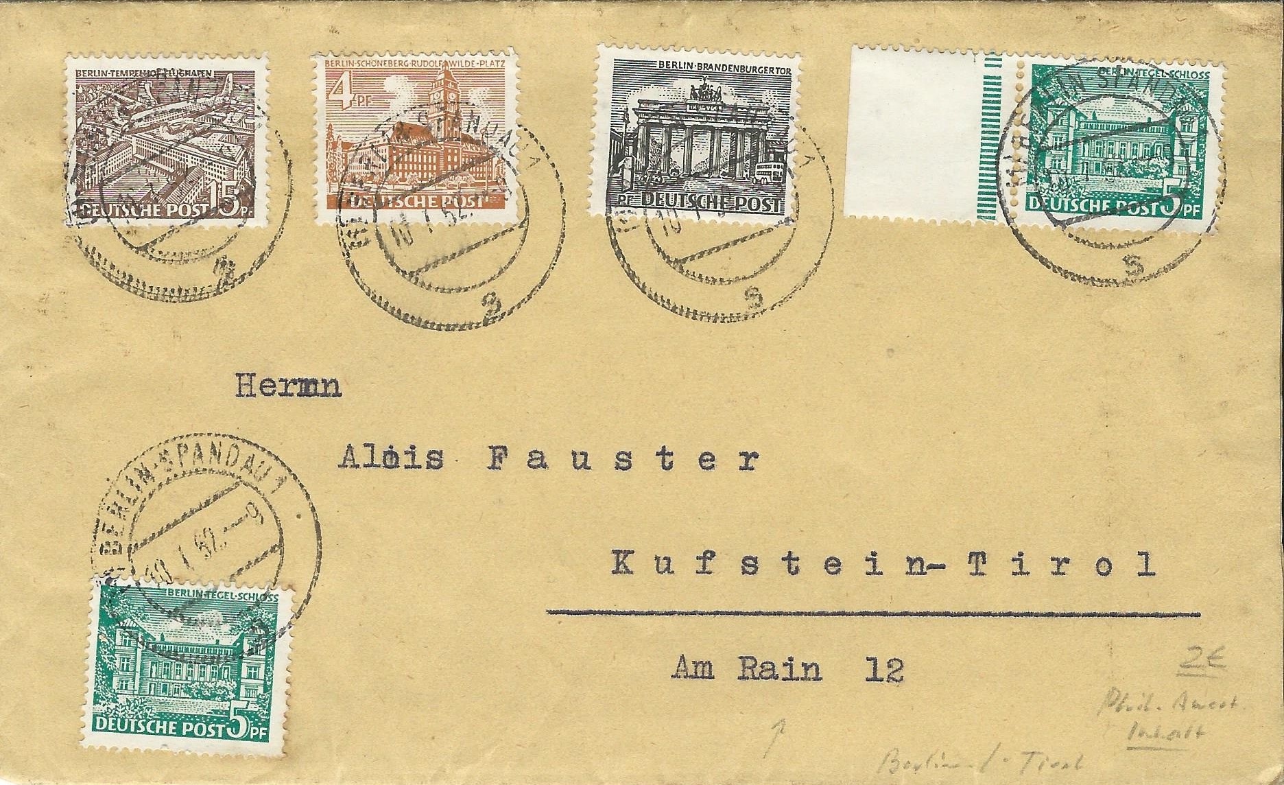 Dazu noch ein Beleg mit einem Unterrandstück nebst weiterer Beifrankatur. Gestempelt wurde hier am 10.1.52 in Berlin-Spandau. Nun soll aber das Blick auf das Randstück fallen: Im Vergleich zu dem vorher gezeigten Beleg ist das Randstück wesentlich breiter ausgefallen. Ferner ist die Strichelleiste im oberen Bereich etwas unterbrochen. Man sieht also mal wieder, es lohnt sich, die Augen offen zu halten.