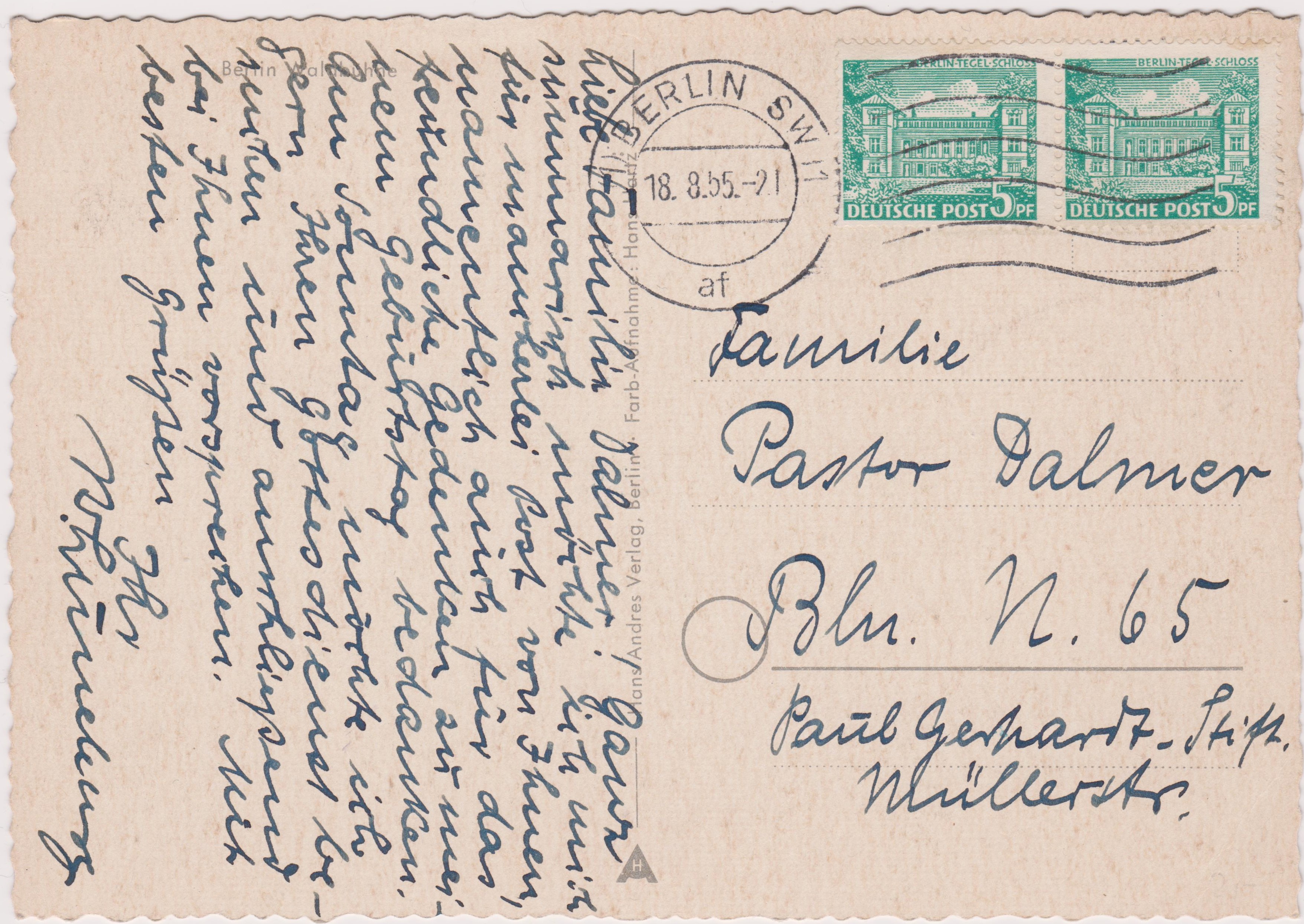 Waagerechtes Paar am 18.08.1955 auf einer Postkarte im Ortsverkehr innerhalb Berlins: