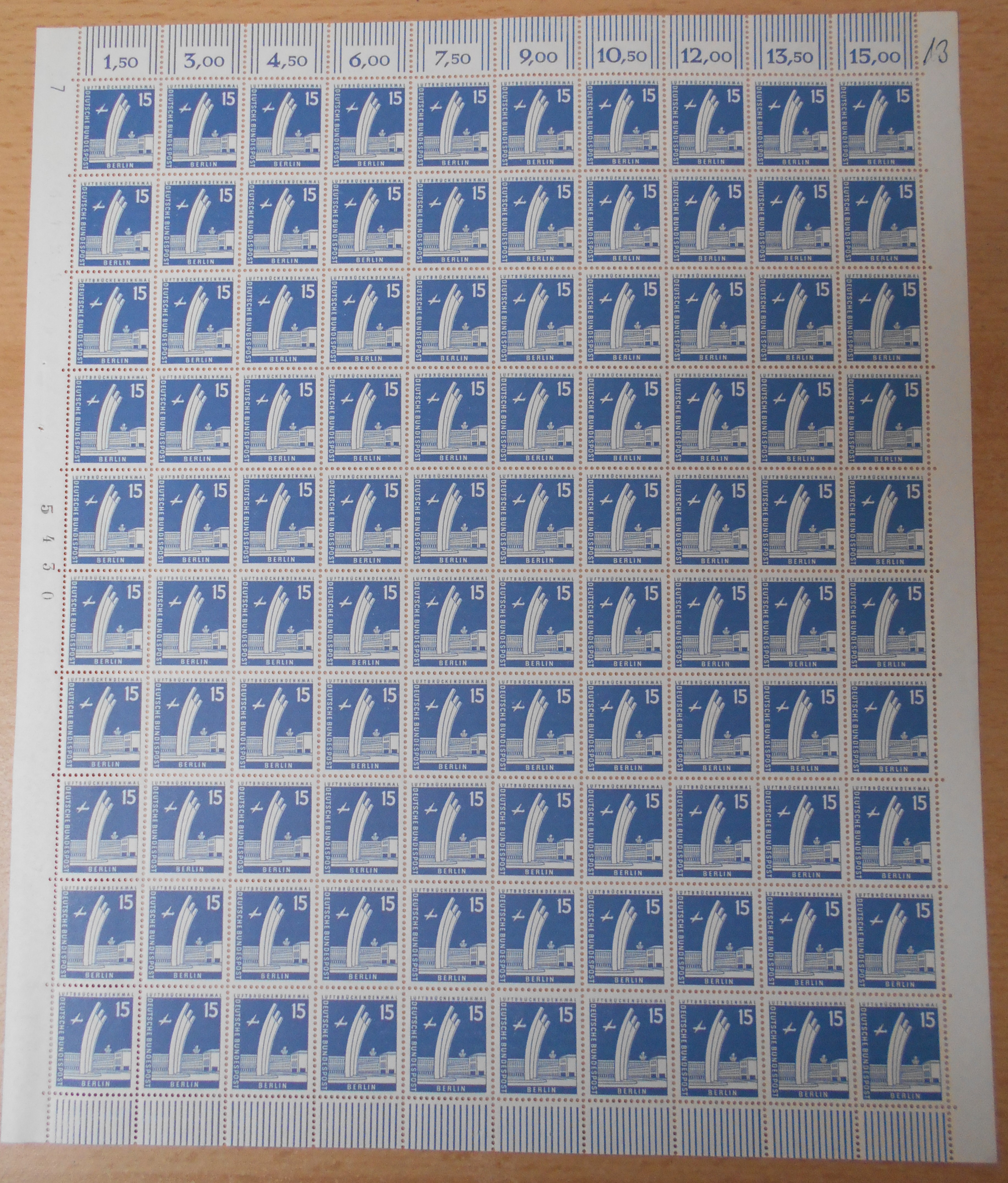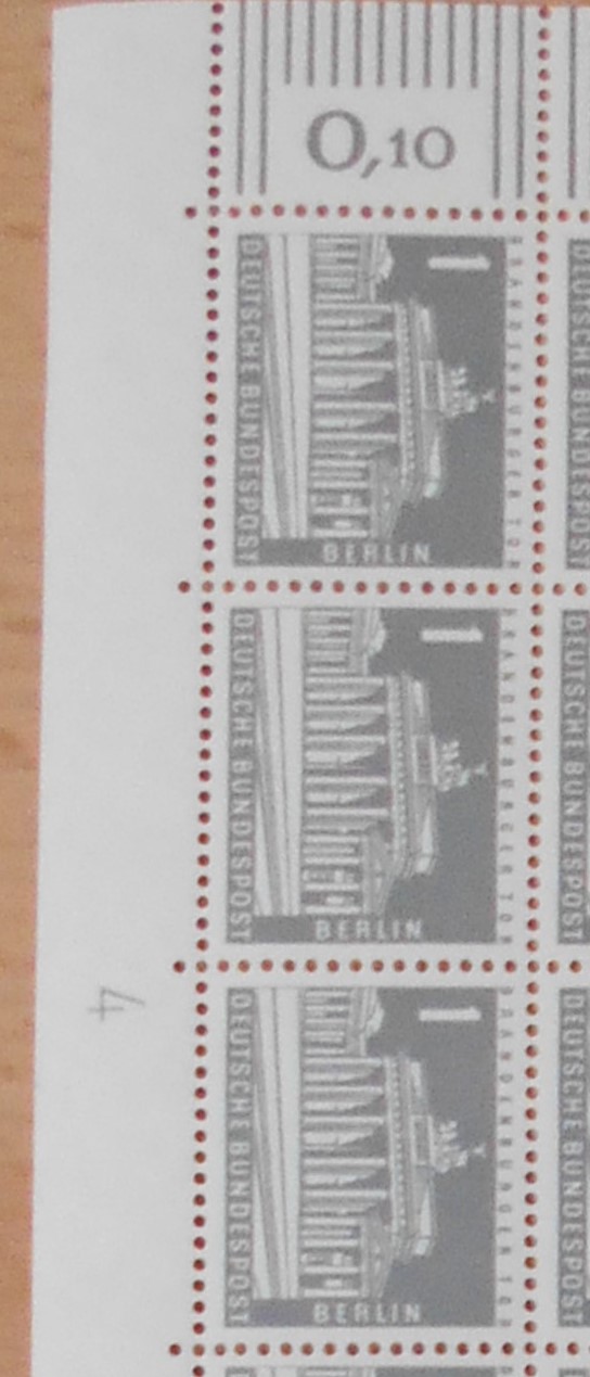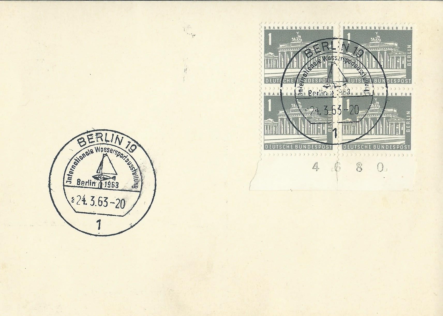von der Marke zu 1 Pf y habe ich hier noch einen 4-er-Block vom linken Seitenrand mit Bogenzählnummer auf einer Stempelvorlagekarte. Gestempelt wurde mit einem Sonderstempel Berlin am 24.3.63.