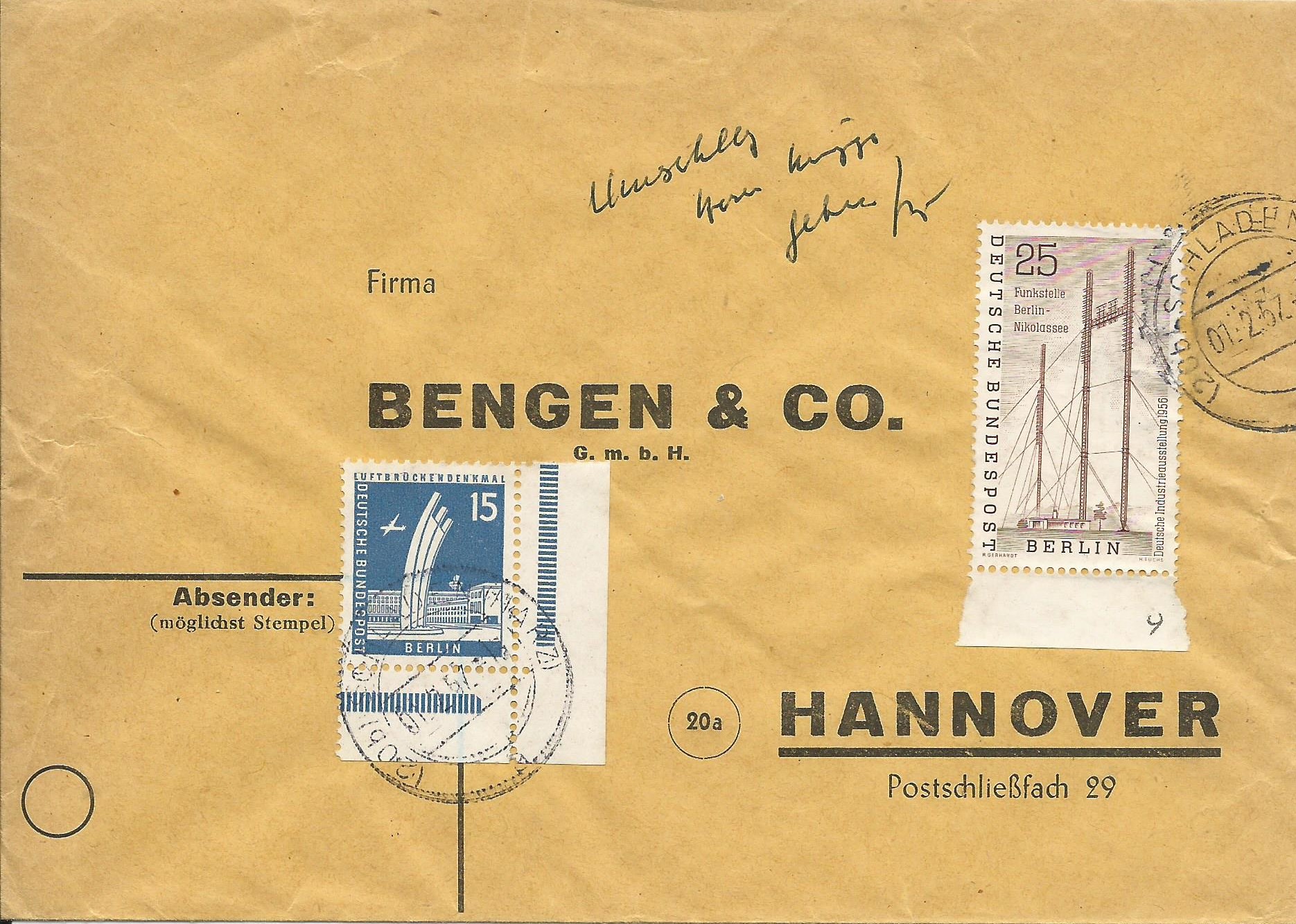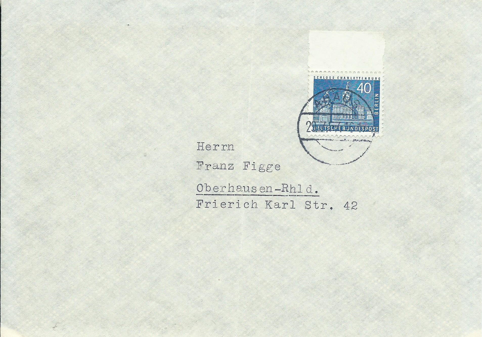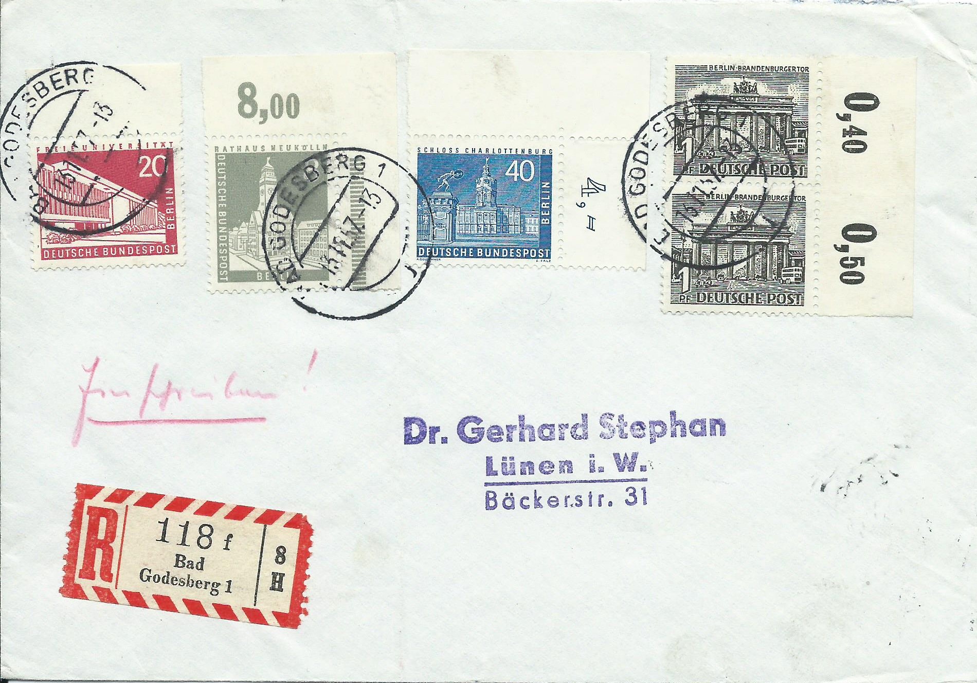 Der nächste Beleg ist eine Wundertüte, was die Frankatur anbelangt. Da lacht das Sammlerherz, lauter Randstücke! In der Reihenfolge wäre jetzt die 8 Pf dran, die hier als rechte obere Bogenecke zu sehen ist. Daneben sind aber noch eine linke obere Bogenecke zu 40 Pf, ein linkes Seitenrandstück zu 20 Pf sowie ein Oberrandpaar der Berliner Bauten I 1 Pf verklebt worden. Gestempelt wurde der Einschreibbrief in Bad Godesberg am 13.11.57.