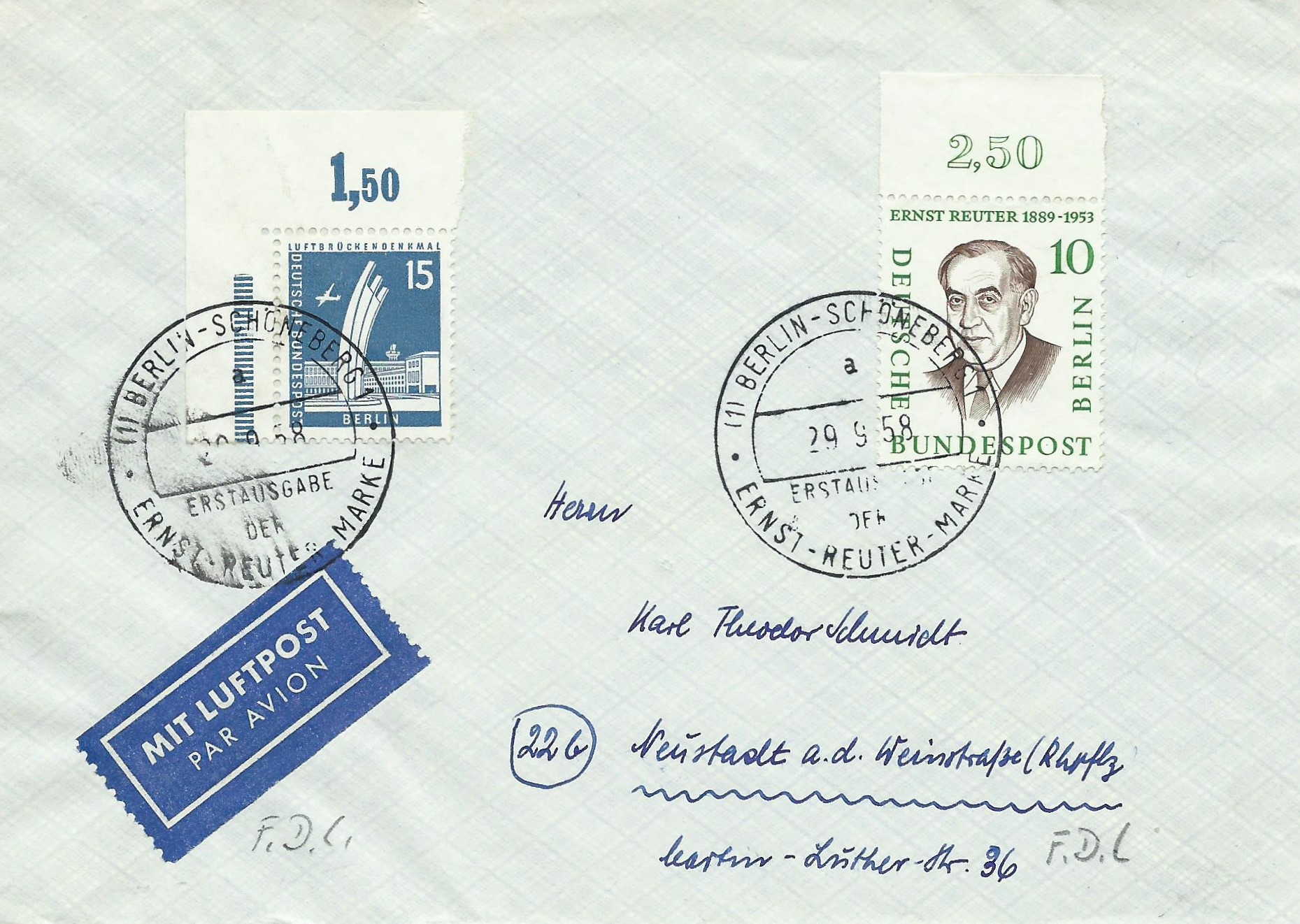 Vom Wert zu 15 Pf kommt nun ein Beleg mit einer linken oberen Bogenecke vom Plattendruck, zusammen mit einer Sondermarke zu 10 Pf Ernst Reuter. Der Luftpost-Beleg wurde am 29.9.58 in Berlin-Schöneberg abgestempelt. Die Ausgabe im "Walzendruck" wurde ebenfalls zu Beginn schon vorgestellt und an dieser Stelle ausgelassen.