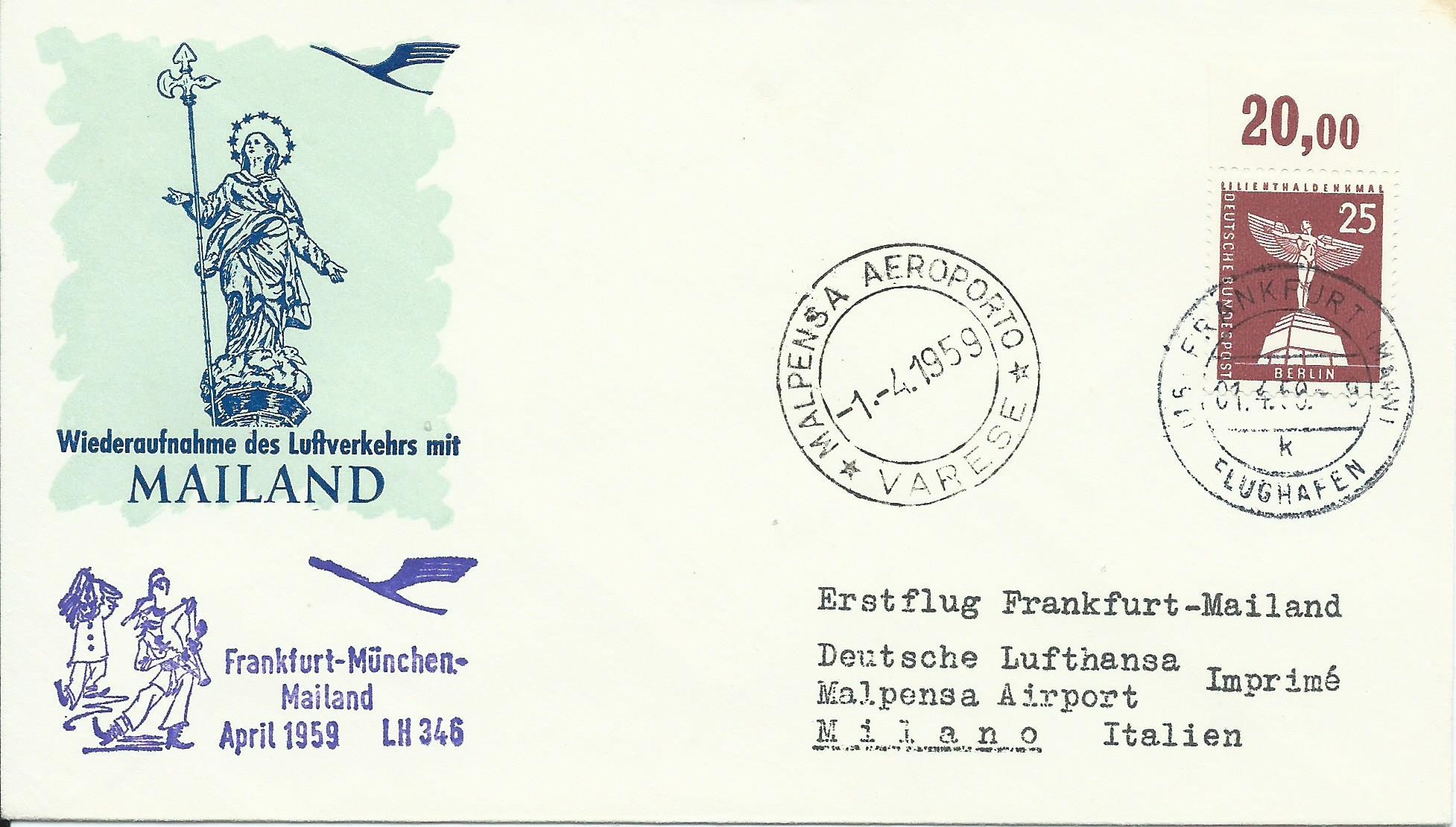 Der Wert zu 25 Pf vom Oberrand mit Reihenwertzähler 20,00 ziert einen Luftpost-Brief von Frankfurt nach Milano (Mailand) in Italien, abgestempelt am 1.4.59. Nebenbei ist das ein Erstflugbeleg zur Wiederaufnahme des Luftverkehrs nach Mailand. Um einen solchen Beleg könnten sich 2 Interessenten „streiten“, einmal der Luftpostsammler und einmal der (wie ich) Dauerserien-Besonderheiten-Sammler.