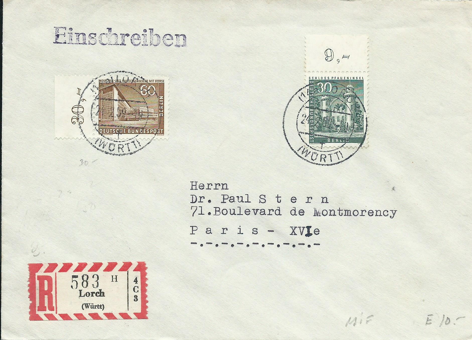Der nächste Beleg zeigt uns 2 Oberrandstücke, einmal den Wert zu 30 Pf (Reihenwertzähler 9,-) und einmal 60Pf (Reihenwertzähler 30,-) auf einem Einschreib-Brief nach Paris. Gestempelt wurde er in Lorch am 27.2.59.