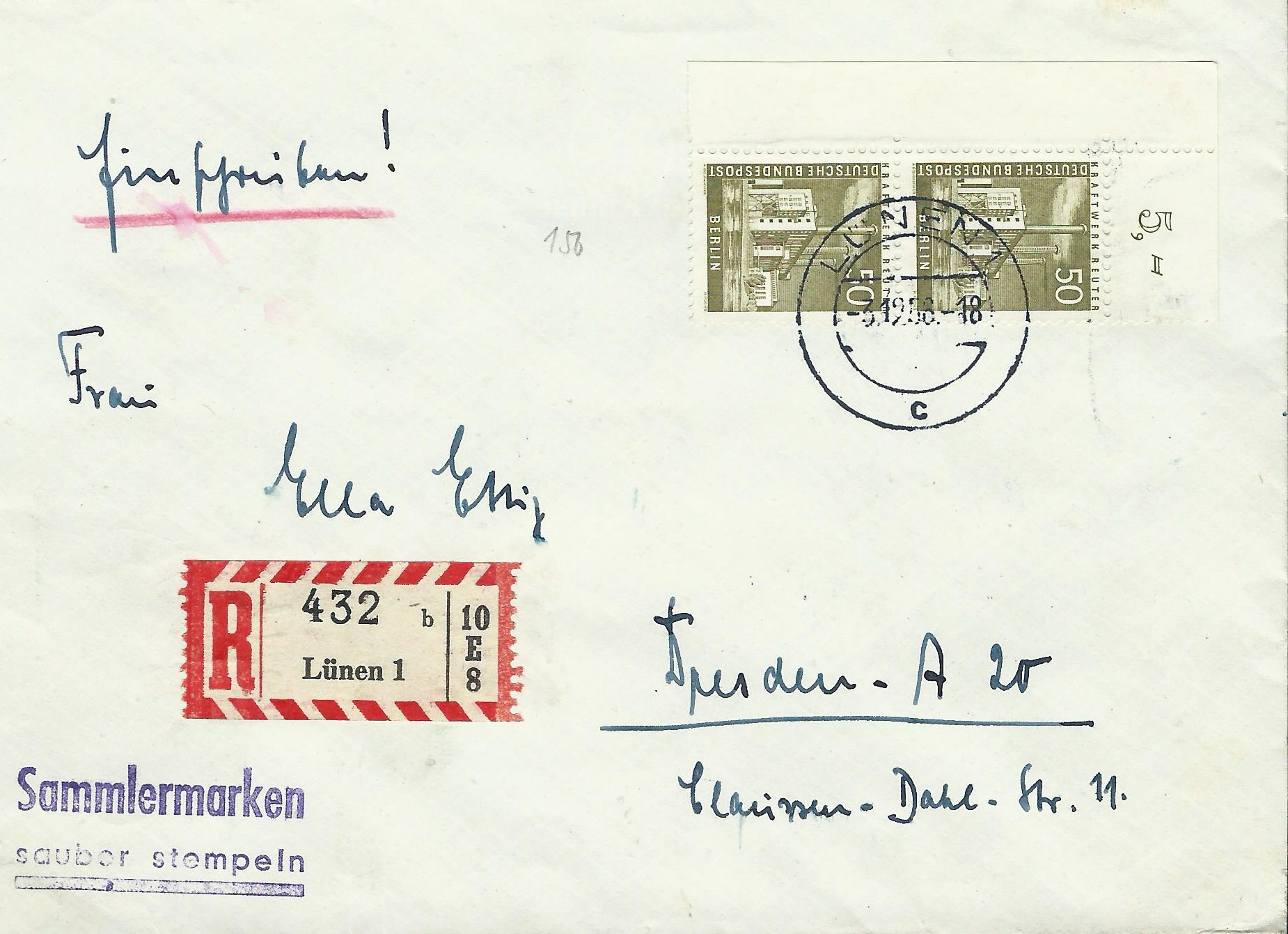 Der Wert zu 50 Pf ist hier als senkrechtes Paar aus der linken oberen Bogenecke zu sehen. Das Stück klebt auf einem Einschreib-Brief und wurde am 3.12.58 in Lünen abgestempelt.