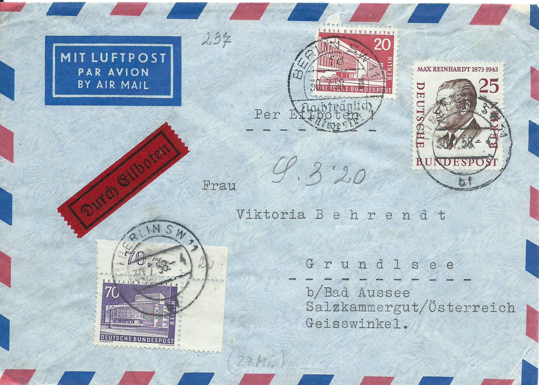 Die Wertstufe 60 Pf hatten wir ja bereits zusammen mit der 30 Pf-Marke dokumentiert, daher geht es gleich weiter mit dem Wert zu 70 Pf. Der klebt hier als rechte obere Bogenecke zusammen mit weiterer Beifrankatur auf einem Luftpost-Eilbrief nach Österreich. Gestempelt wurde in Berlin SW 11 am 30.7.58.