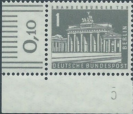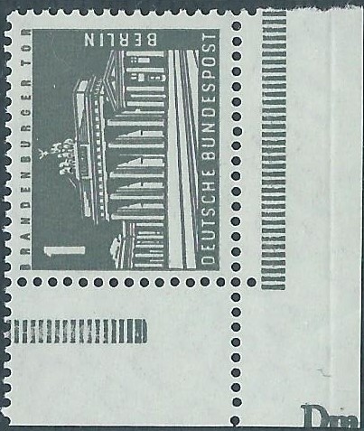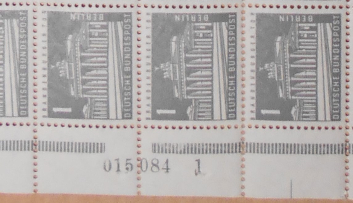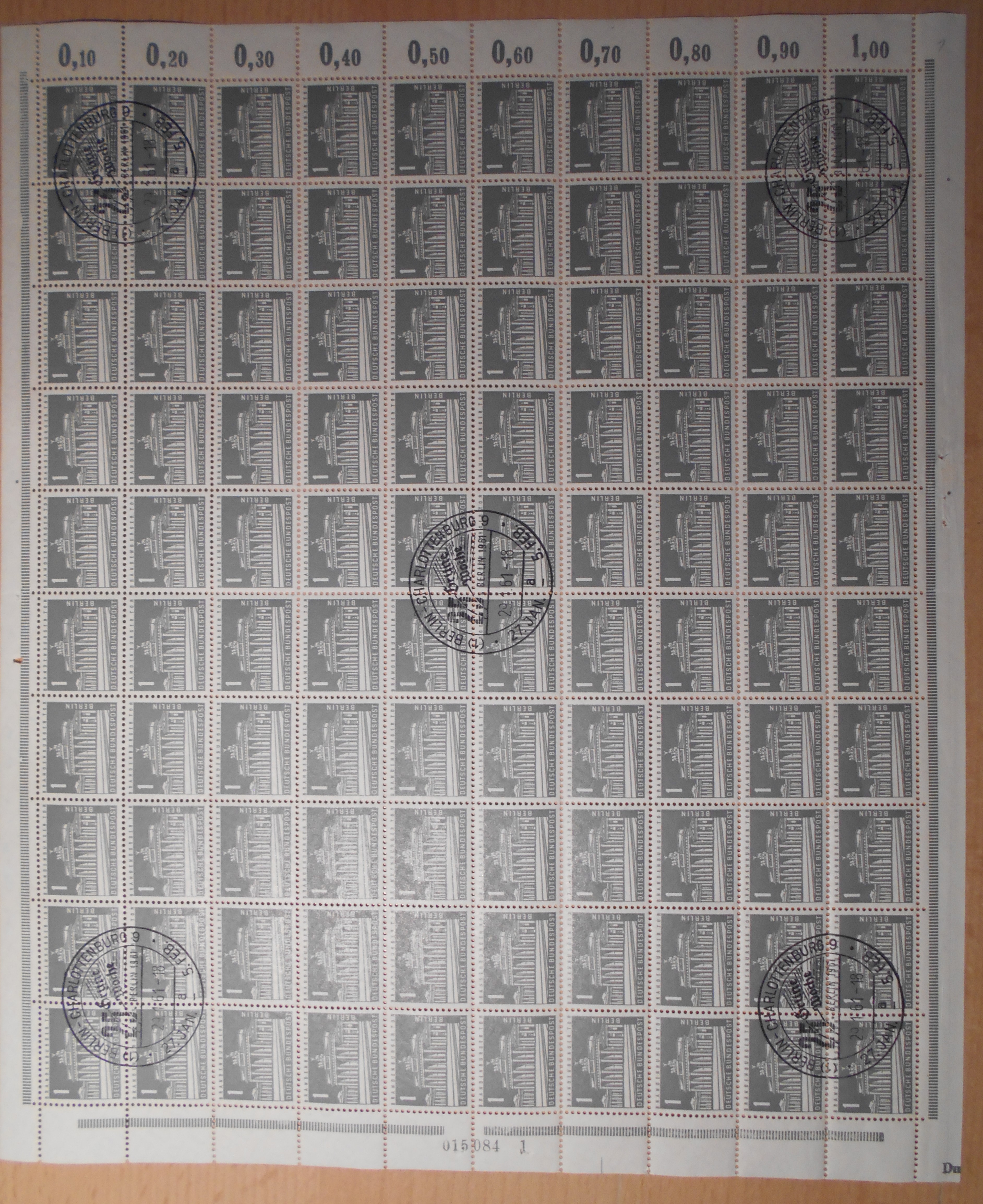 im letzten Beitrag hatte ich „etwas Besonderes“ gezeigt. Das Druckerzeichen Dm aus der rechten unteren Bogenecke habe ich auch in gestempelter Form vorliegen. Vor längerer Zeit habe ich einen kompletten Bogen erwerben können, auf dem die 4 Eckrand-4-er-Blöcke und ein mittlerer 4-er-Block gestempelt wurden. Hier haben wir einmal einen kompletten Bogen, auf dem die ganzen Randbedruckungen zu sehen sind. Am Oberrand die Reihenwertzähler, senkrecht sowie unten im Rand die Strichelleisten und unten mittig die Hausauftragsnummer. Das Druckerzeichen sehen wir ganz rechts unten. Ich habe den Bogen mit der Digitalkamera fotografiert, er passt nicht auf den Scanner und ich möchte ihn auch nicht darauf legen, damit er keinen Schaden nimmt, wenn der Deckel draufliegt. Aber ich denke mal, man kann auch so alles erkennen.