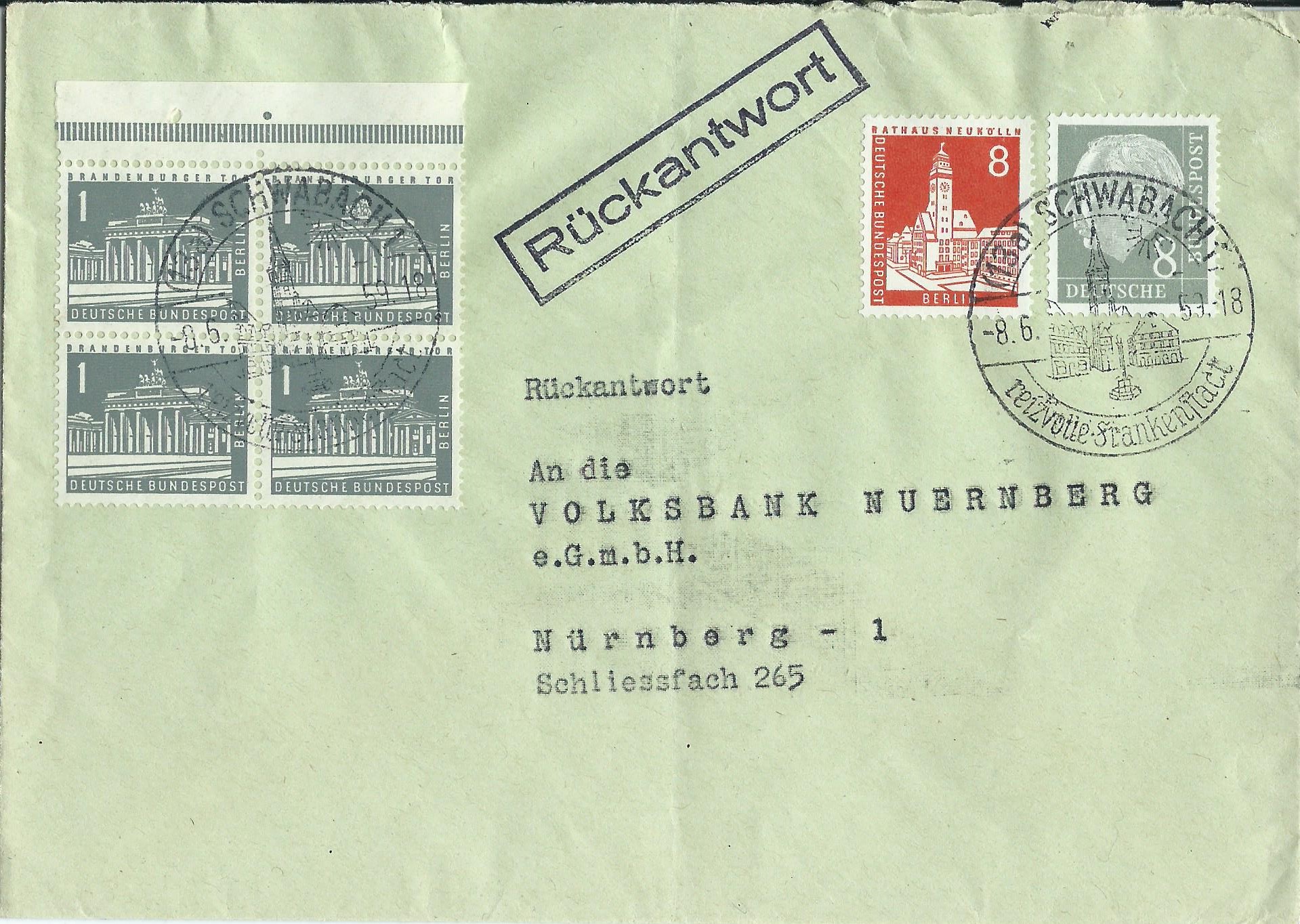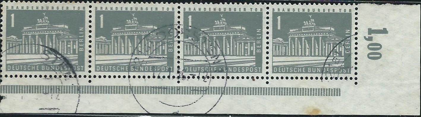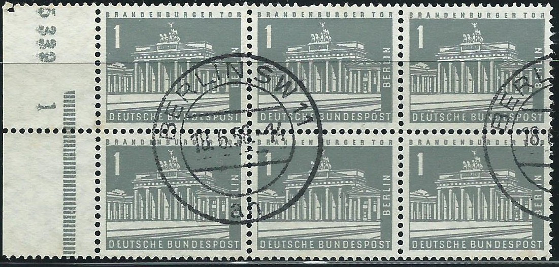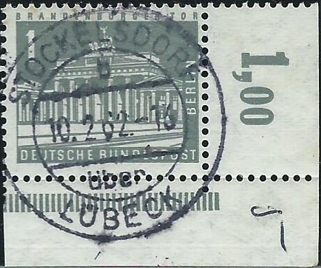 Den Anfang macht eine 140 x aus der rechten oberen Bogenecke mit Reihenwertzähler. Gestempelt wurde hier am 10.2.62 in Stockelsdorf über Lübeck. (Das Stück muss ich hier besonders unter Verschluss halten. Für diesen nicht gerade häufigen Stempel laufen hier in der Region einige Heimatsammler rum, die da garantiert scharf drauf sind…)
