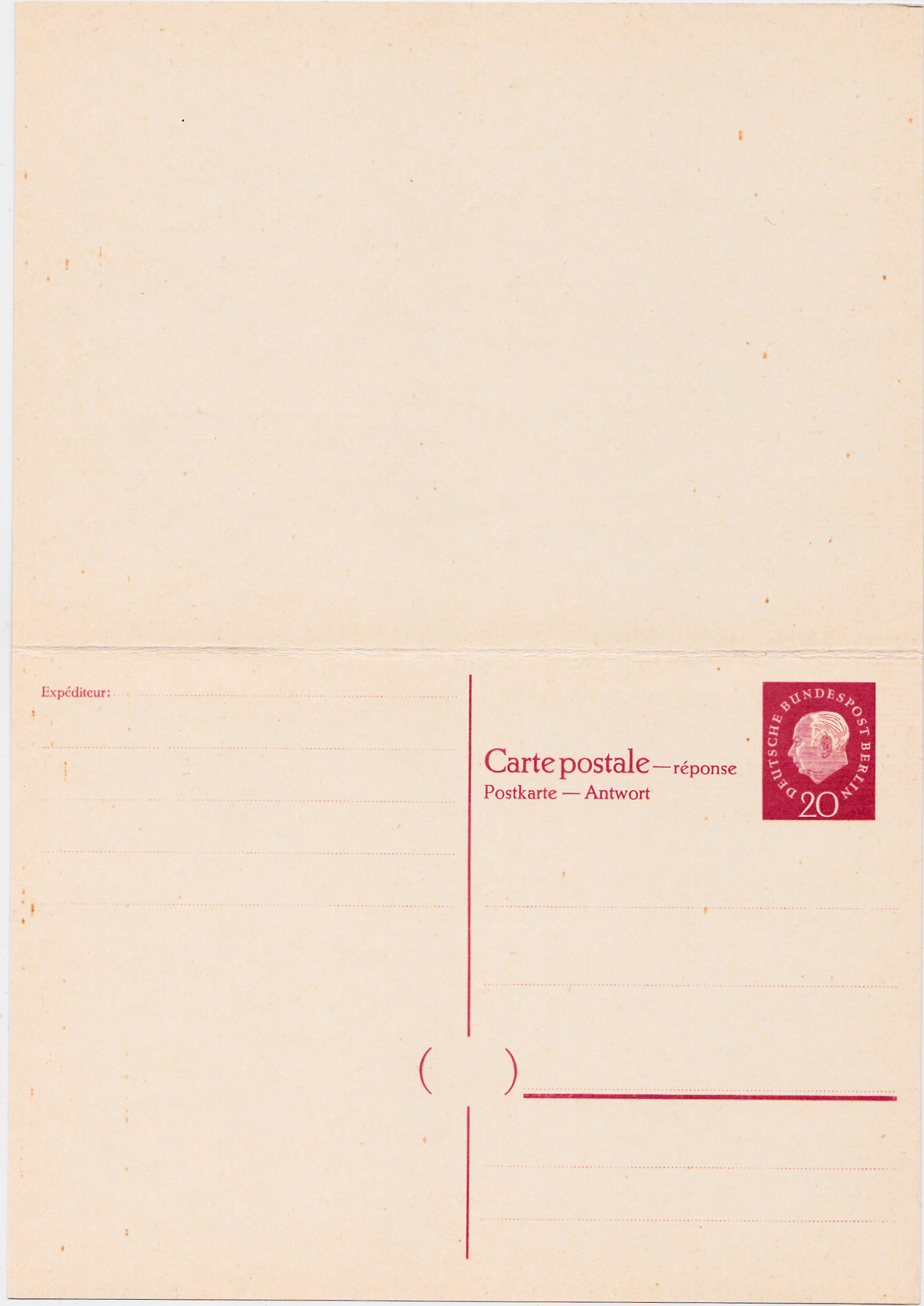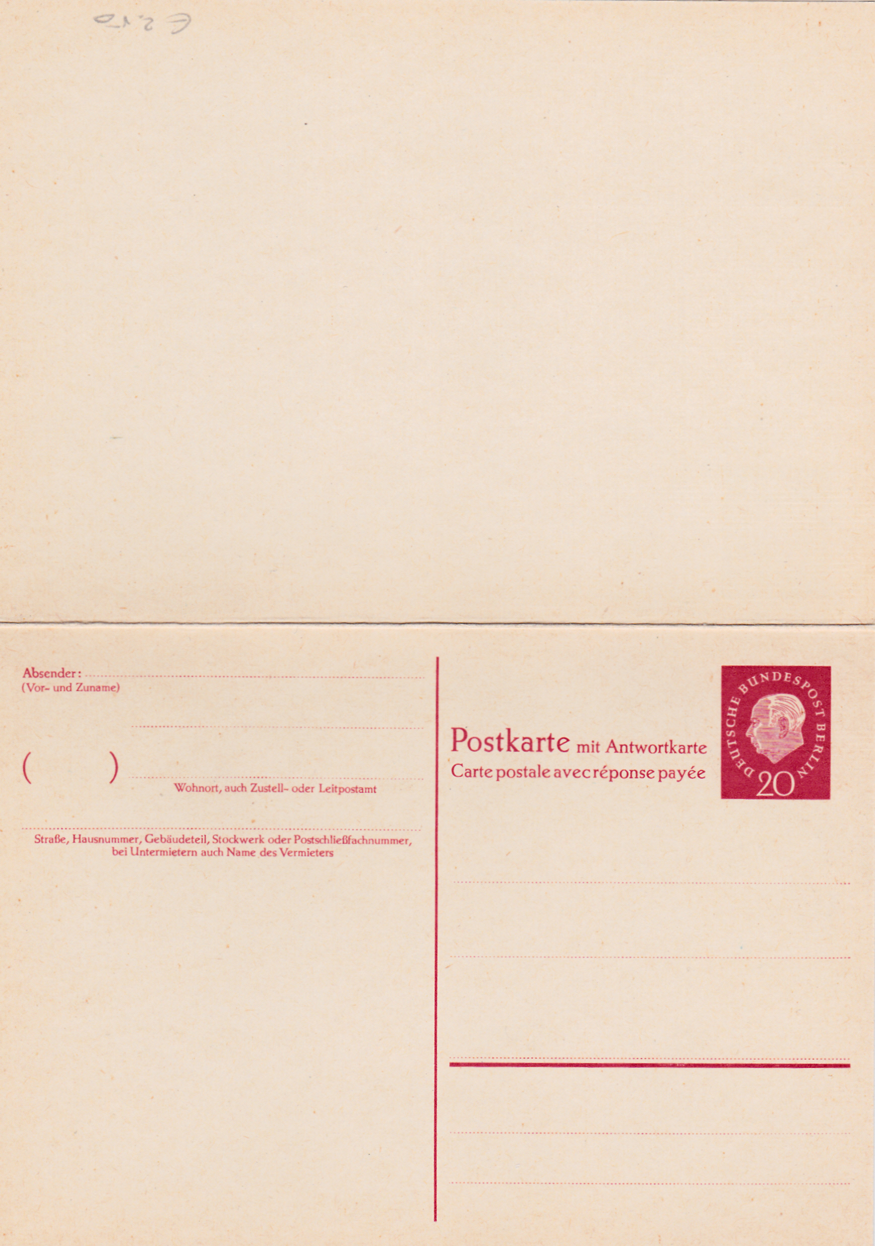 Die Auslandspostkarte mit anhängender Antwortkarte (MiNr P 48) haben je einen Wertstempel der bildgleichen 20 Pf-Marke. Hier zeige ich ein unbenutztes Exemplar.