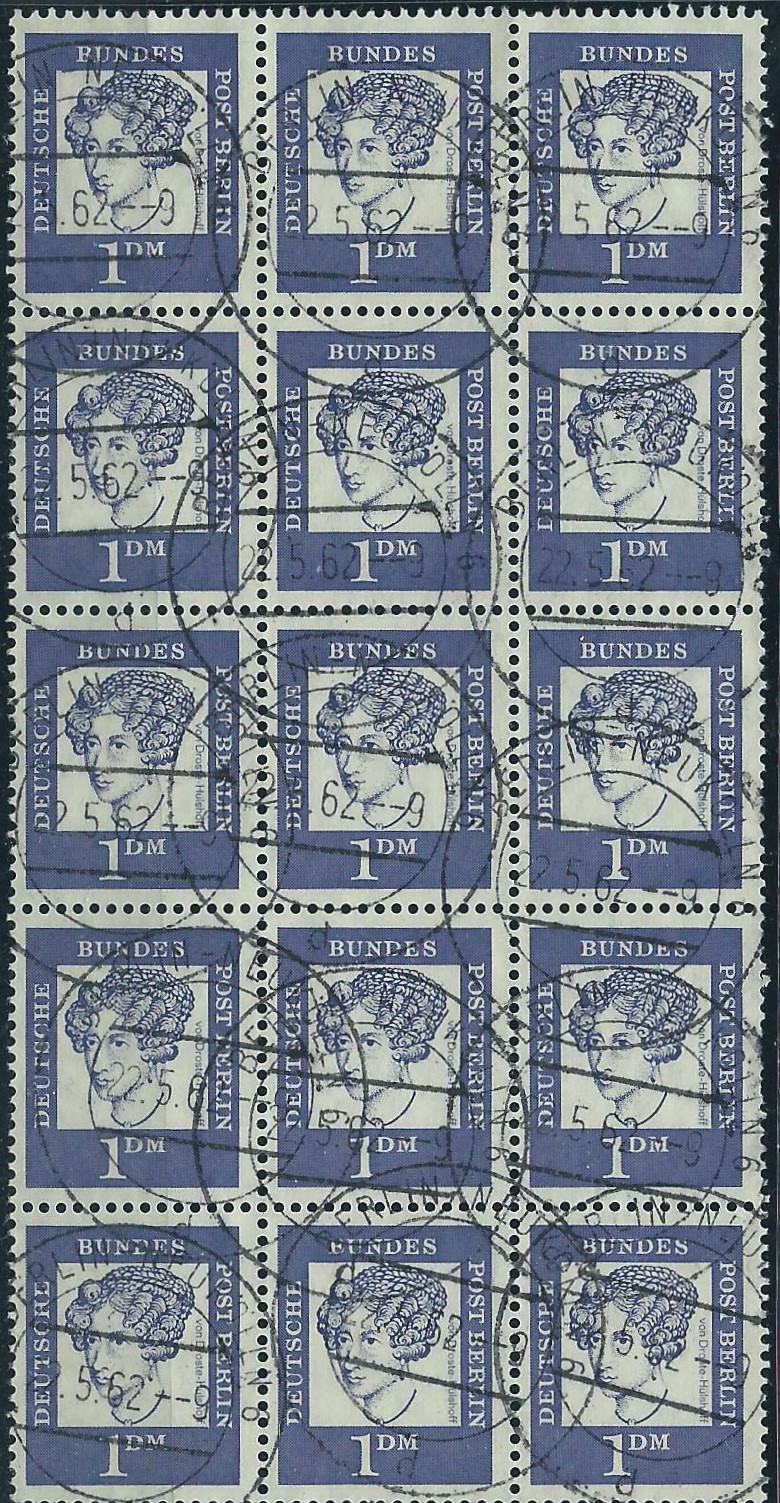 Ein gestempelter 15-er-Block Bedeutende Deutsche Berlin mit Berlin-Stempel!!! So ein Wahnsinnsteil habe ich noch nie gesehen! Einen 6-er-Block ja, aber einen 15-er-Block? Er wurde gestempelt am 22.5.62 in Berlin-Neukölln, fast jede Marke auch noch mit Vollstempel. Im ersten Moment dachte ich nur: Der wird unbezahlbar für mich. Ansehen musste ich mir das Stück trotzdem und stellte bei der genauen Betrachtung fest, dass der auch auf jeder einzelnen Marke geprüft Schlegel war! Ein Hammer!!! Und dann kam die Preisfrage: Er verlangte 30 €. So schnell hatte ich noch nie die Geldbörse draussen, das Teil musste ich haben!