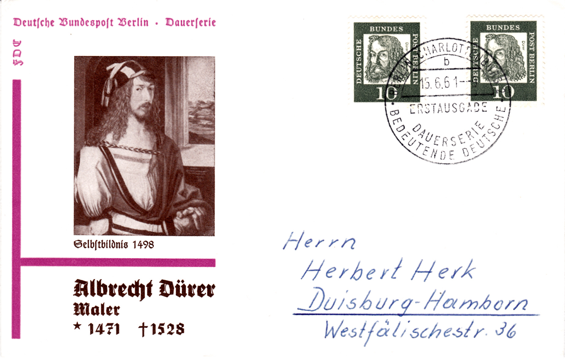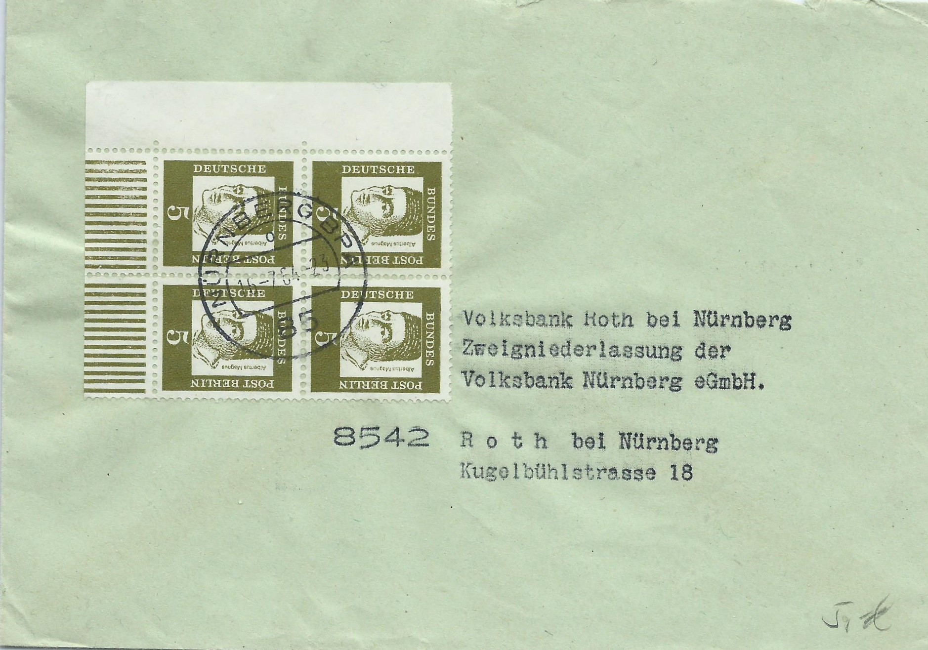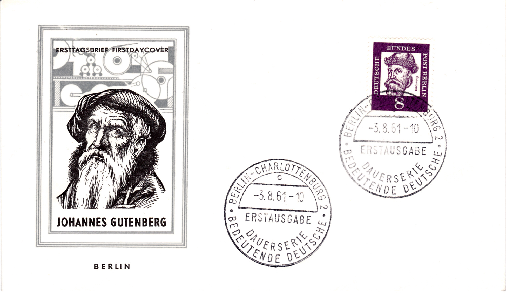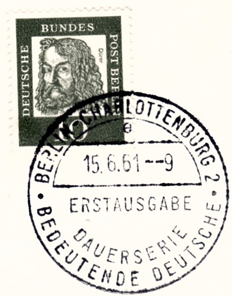 Bernd HL hat vor einiger Zeit hier bereits die Ersttagsonderstempel mit den Kennbuchstaben "a", "d" und "e" vorgestellt. Heute kann ich auf diesem FDC mit der Marke zu 8Pf einen weiteren Kennbuchstaben zeigen. Dieser Stempel trägt den Buchstaben "c".