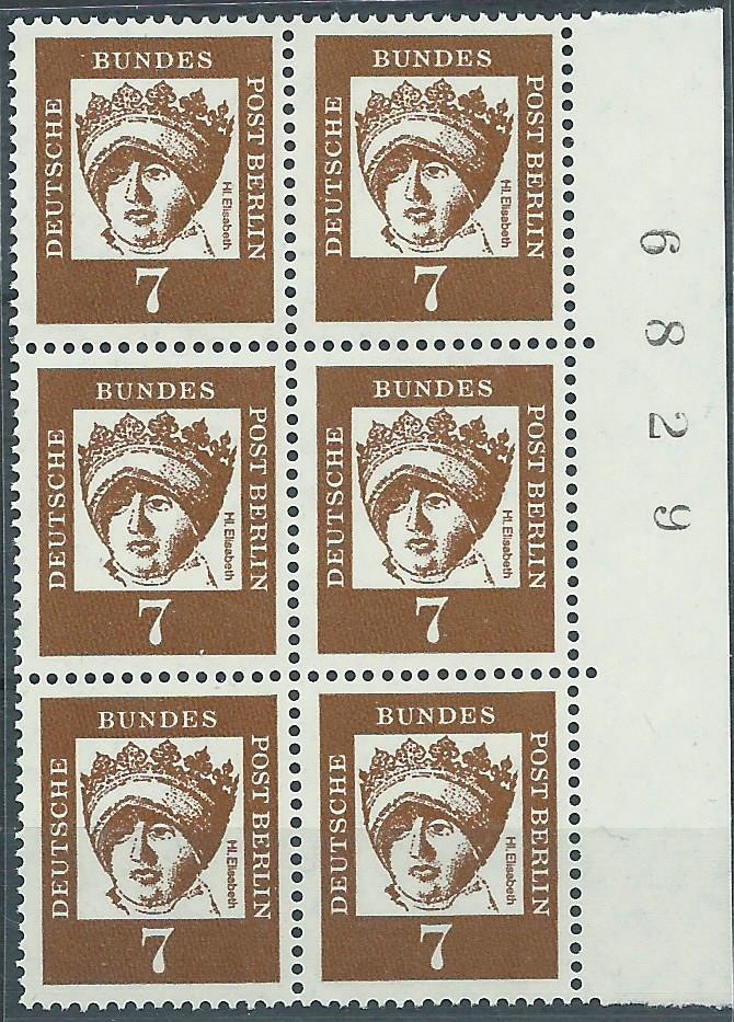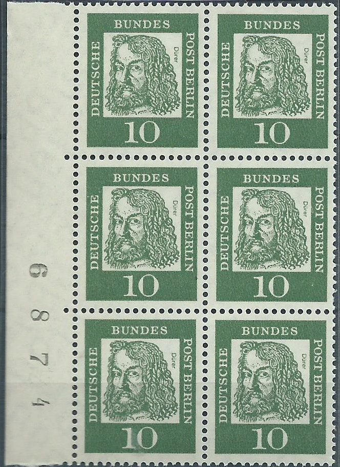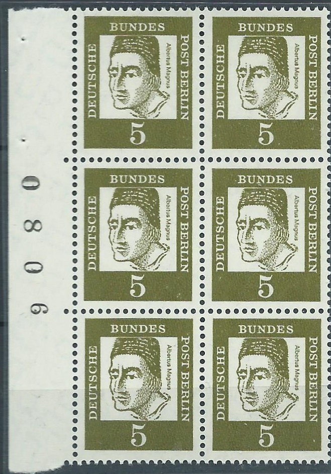 für kleinstes Geld konnte ich ein Lot postfrische Bogenzählnummern Bedeutende Deutsche Berlin in senkrechter 6-er-Block-Form erwerben, die einzelnen Werte sollen hier gezeigt werden: