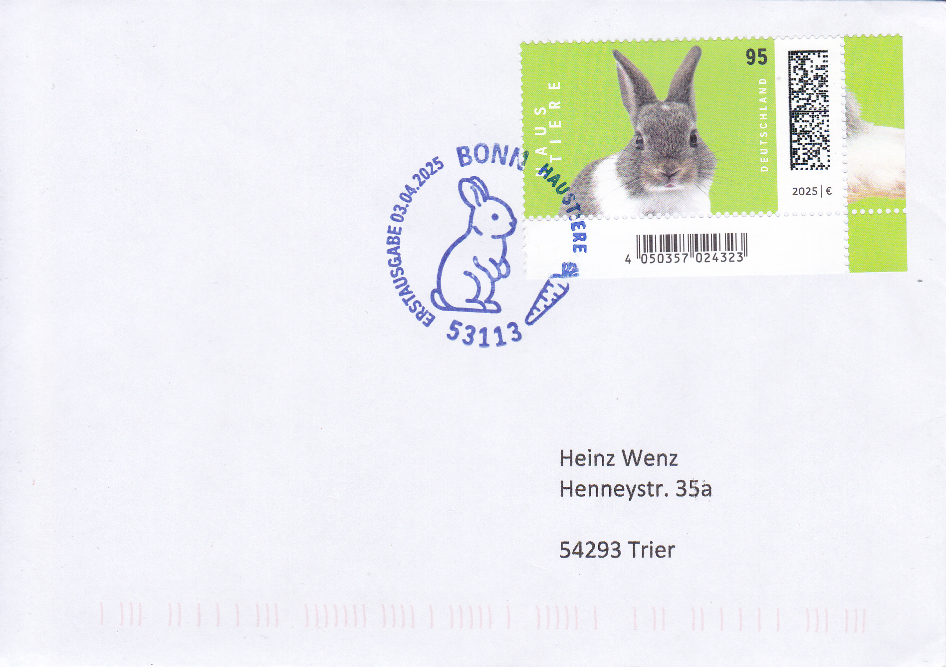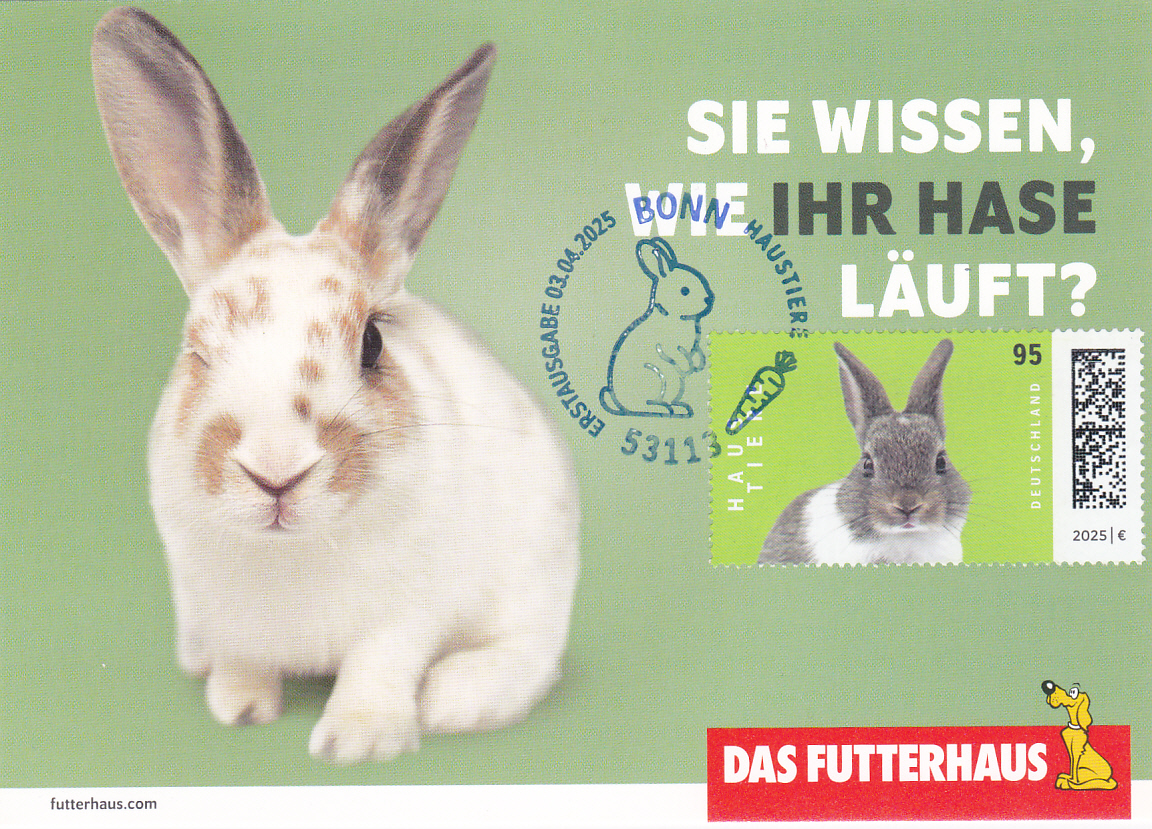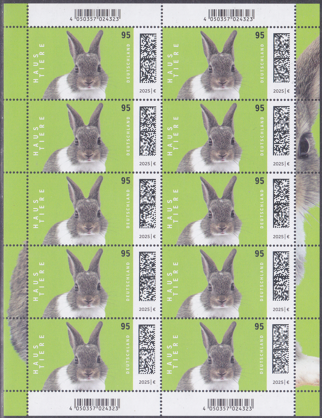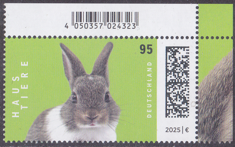 In der Serie "Haustiere" der Deutschen Post ist eine Marke (MiNr 3899) mit einem Farbenzwergkaninchen (Oryctolagus cuniculus forma domestica) erschienen. Hier zeige ich eine Marke vom Eckrand mit EAN-Codierung.