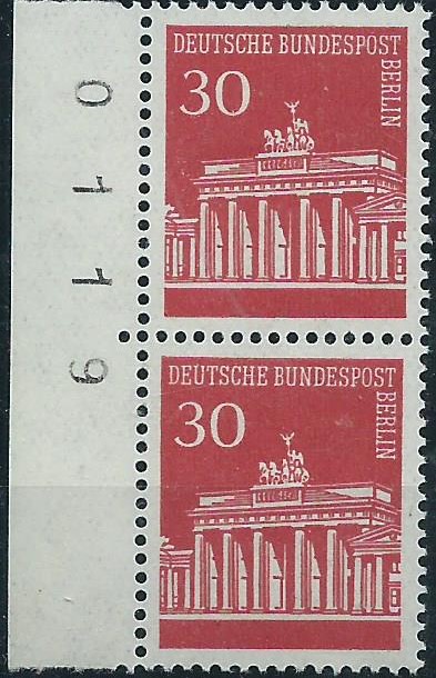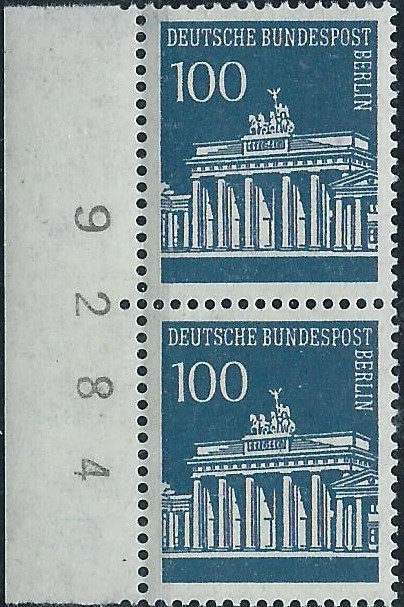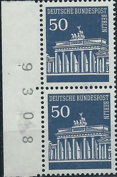 auf diesem Beleg sind 2 Zusammendrucke aus dem Heftchenbogen Brandenburger Tor verklebt worden. Einmal der Zusammendruck W 43 (30/20/10) und einmal W 45 (20/30). Gestempelt wurde er in Donaueschingen am 5.8.91 und ist mit 110 Pf auch portorichtig frankiert. Beim W 45 ist rechts noch der Seitenrand vorhanden, der macht die Sache richtig interessant! Dort ist noch ein kleiner roter Strich, der Anlagestrich zu sehen! Den haben wir hier im Thread weiter vorne schon mal beschrieben.