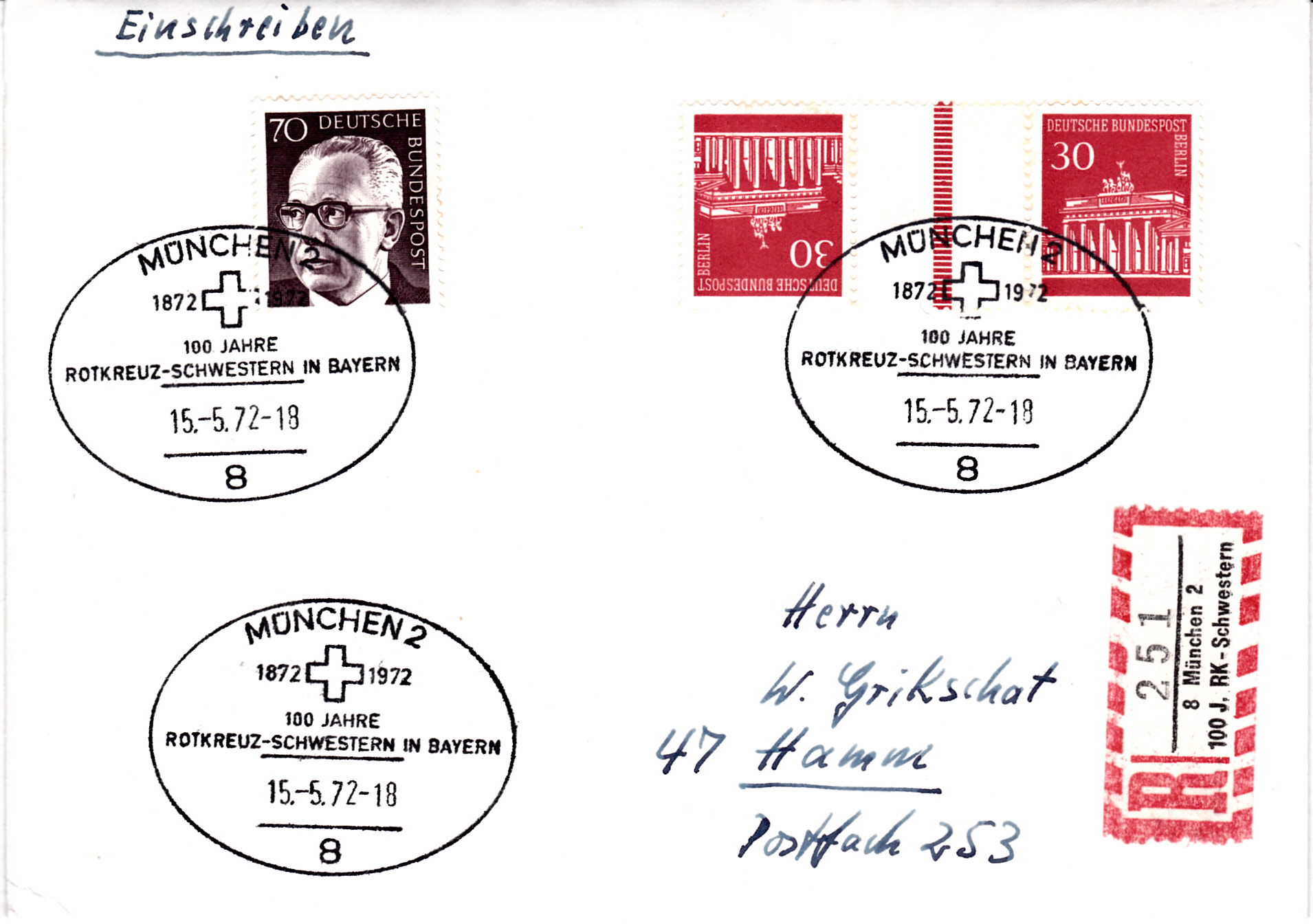 Auf diesem Brief mit Einschreiben von München nach Hamm mit einem Sonder-R-Zettel und dem dazu passenden Sonderstempel wurde zur Frankatur auch ein Kehrdruck mit Zwischensteg (MiNr KZ 3b) mit nur einer Strichelleiste zur Frankatur verwandt.