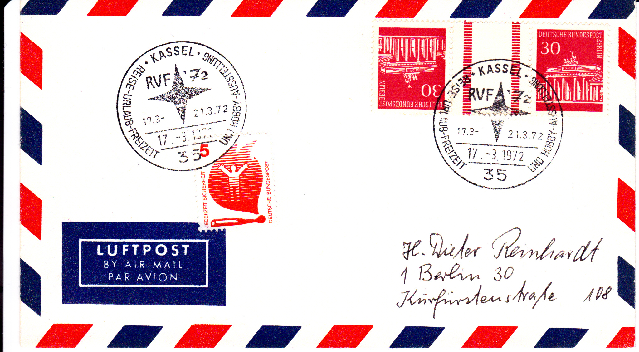 Luftpostbrief nach Berlin mit einem Kehrdruck mit Zwischensteg (MiNr KZ 3a) aus dem Markenheftchenbogen MiNr 5 und einem 5 Pf Wert der DS Bund Unfallverhütung. Das verklebte Porto reicht für einen Brief von 41 bis 50 Gramm (Brief bis 50 g 50 Pf + 3 x 5 Pf je 20 g).
