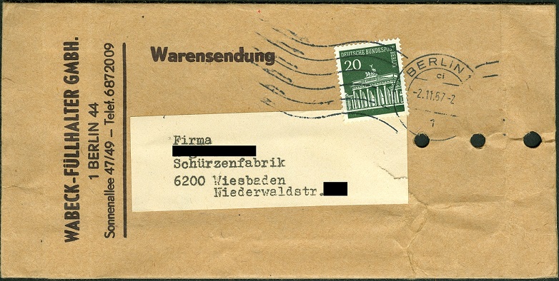 Ein Einschreibbrief mit Mischfrankatur der Ausgabe Brandenburger Tor. Verklebt wurden hier eine Marke zu 30 Pf (Mi.Nr. 288) und ein senkrechtes Paar 50 Pf (Mi.Nr. 289). Abgestempelt wurde der Beleg in Berlin 301 am 19.4.67 und die Reise ging von Berlin nach Kiel.