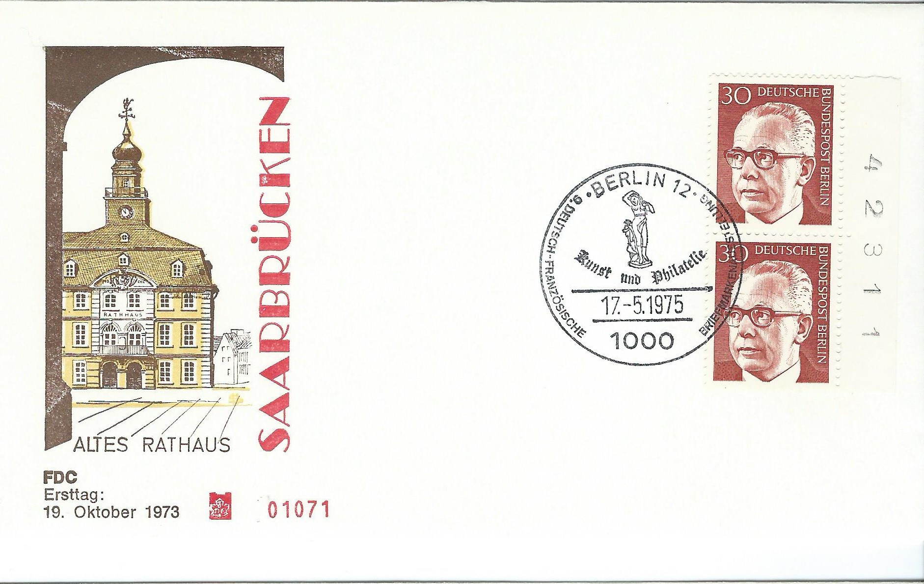 Den Anfang macht ein Ersttagsbrief mit dem Wert zu 10 Pf auf einem Einschreiben. Es wurden insgesamt 11 Marken verklebt, einmal als 8-er-Block, ein waagerechtes Paar und eine Einzelmarke. Gestempelt wurde am 23.10.70 mit dem Ersttagssonderstempel Berlin.