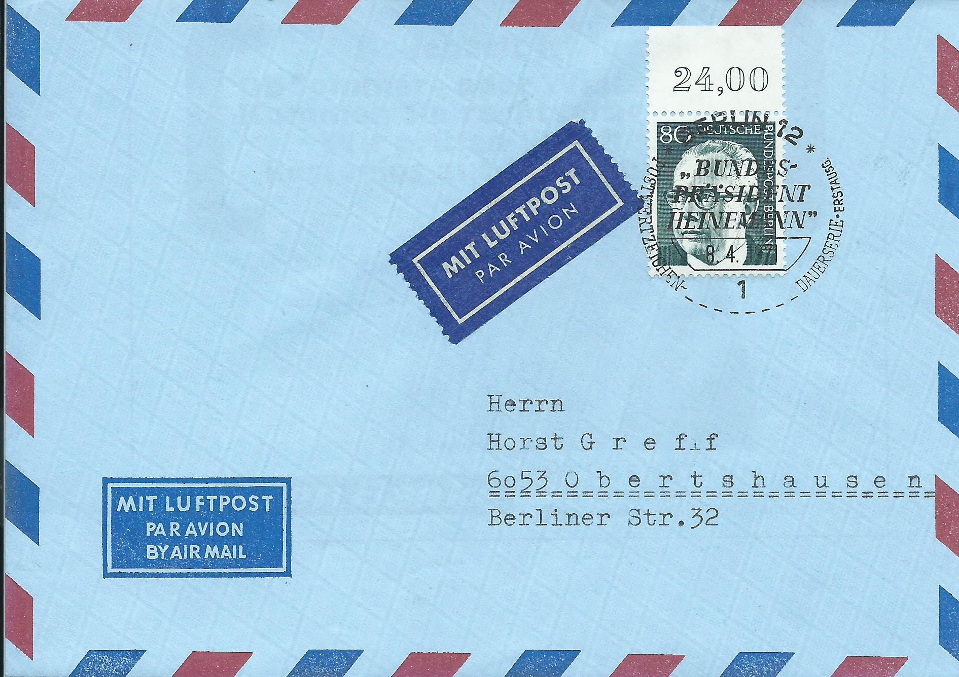 Ein Ersttagsbrief mit dem Wert zu 80 Pf vom Oberrand mit Reihenwertzähler 24,00 auf einem Luftpostbrief. Gestempelt wurde am 8.4.71 mit dem Ersttagssonderstempel Berlin.