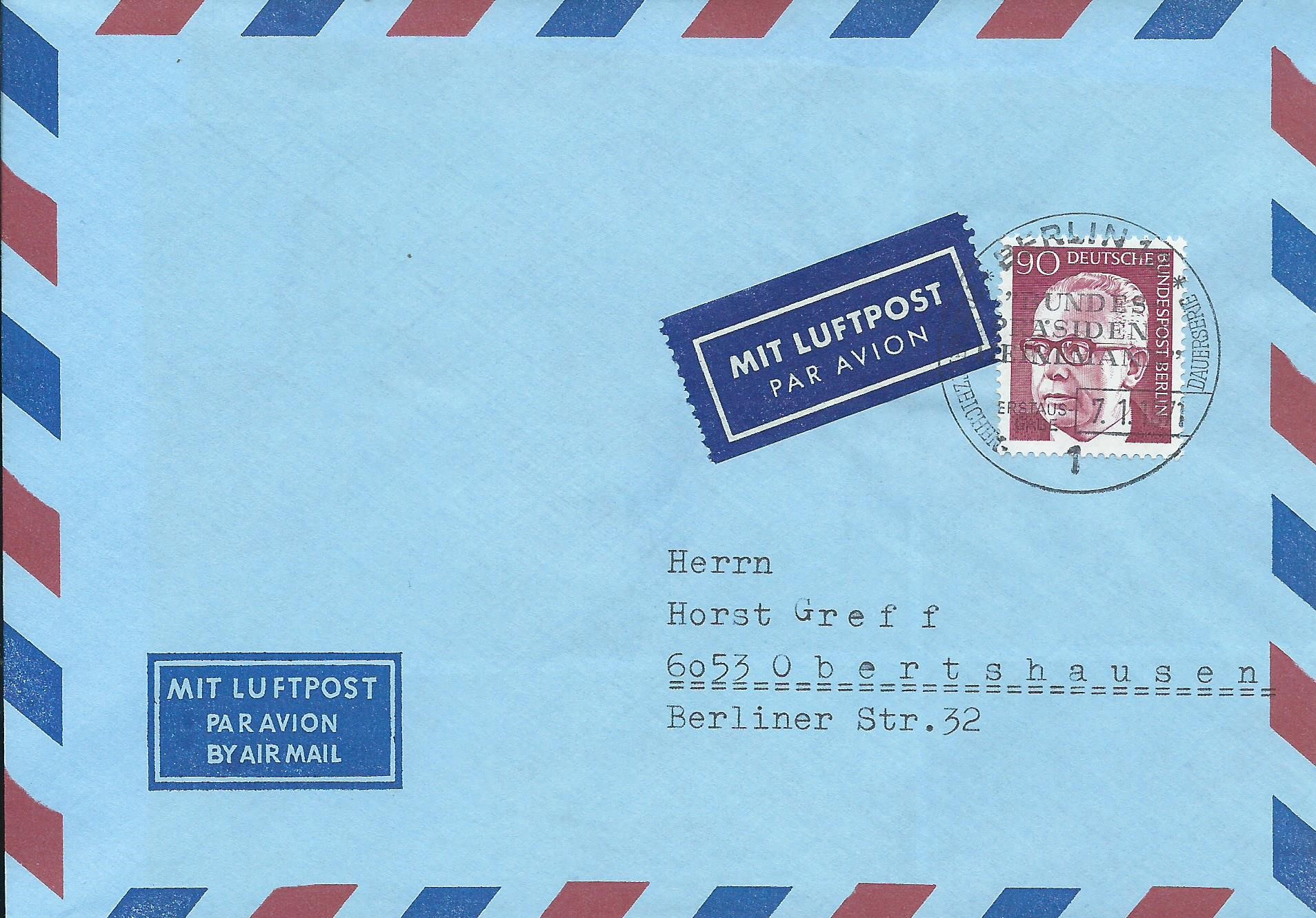 Ein Ersttagsbrief mit dem Wert zu 90 Pf als Einzelmarke auf einem Luftpostbrief. Gestempelt wurde am 7.1.71 mit dem Ersttagssonderstempel Berlin.