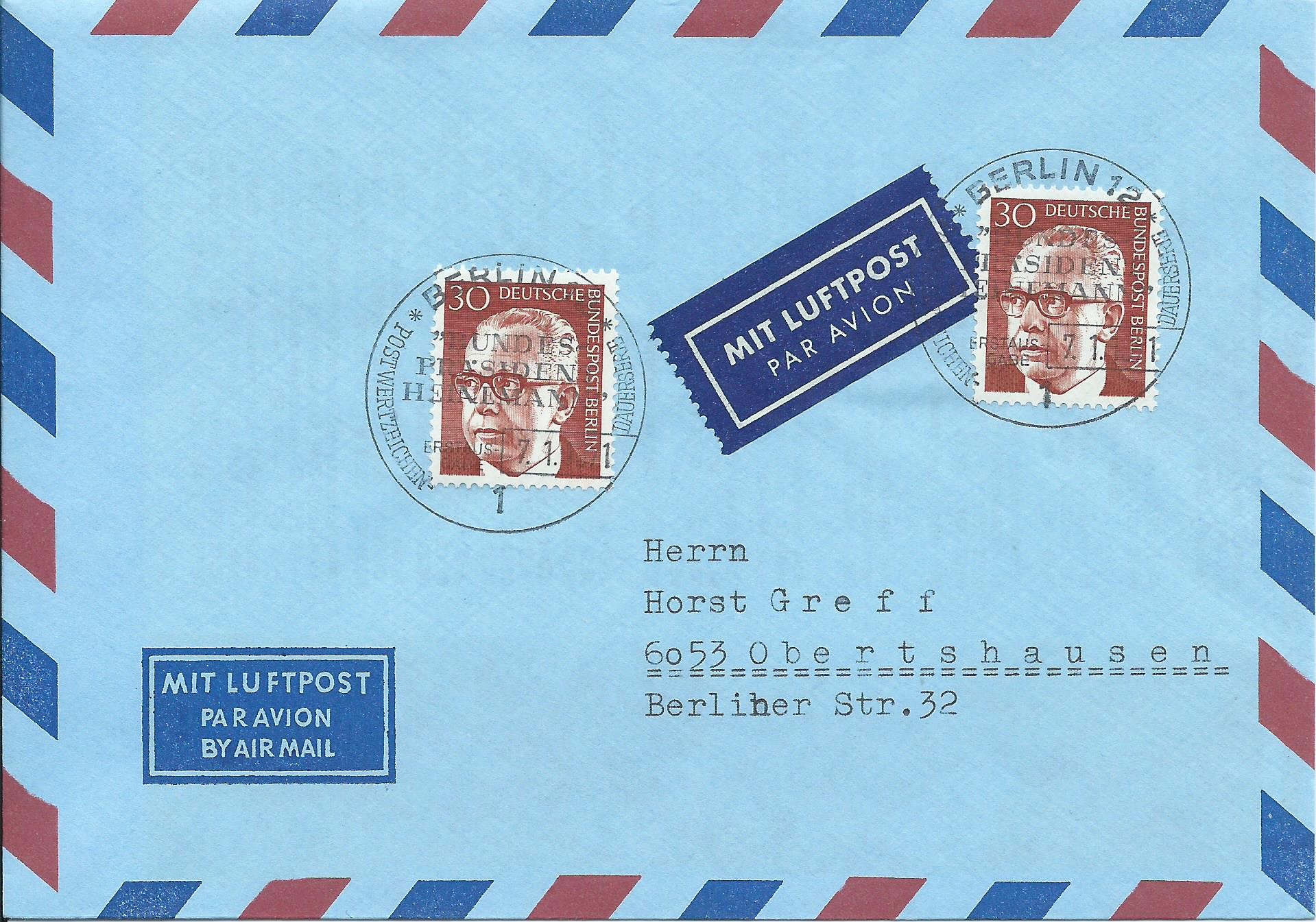 noch ein paar weitere Ersttagsbriefe: Der Wert zu 30 Pf zweimal auf einem Luftpostbrief, gestempelt mit dem Ersttagssonderstempel Berlin am 7.1.71: