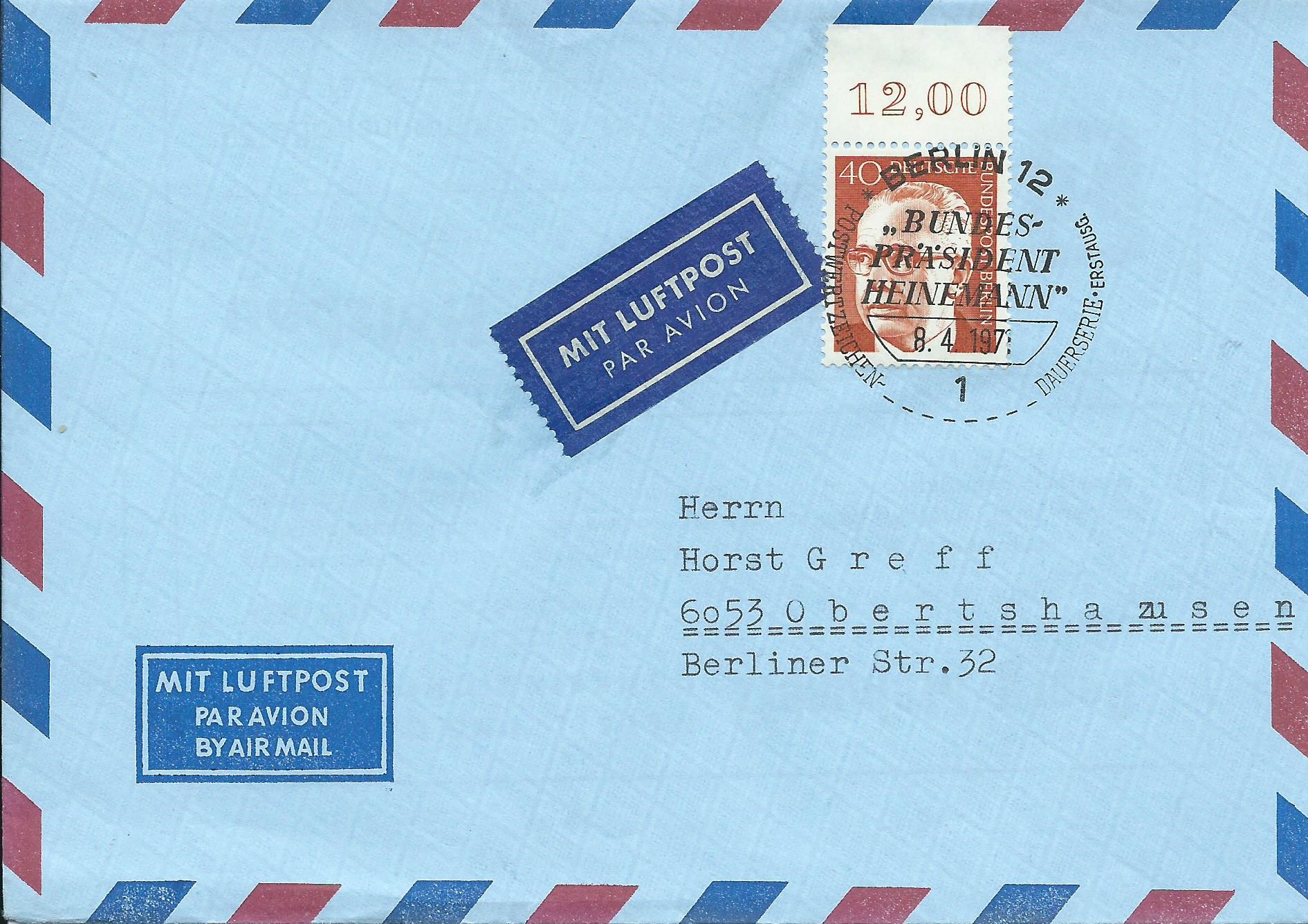 Der Wert zu 40 Pf vom Oberrand mit Reihenwertzähler 12,00 auf einem Luftpostbrief, gestempelt mit dem Ersttagssonderstempel Berlin am 8.4.71: